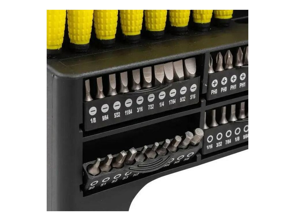 Praktičen in pregleden set 100 kosov izvijačev, bitov, nastavkov in dodatkov, urejenih v stabilnem stojalu. Vsebuje širok nabor ravnih, križnih, Torx, kvadratnih in natančnih izvijačev, skupaj z biti vseh običajnih vrst. Idealno za vsakega domačega mojstra in profesionalca, ki želi imeti vse potrebno pri roki.