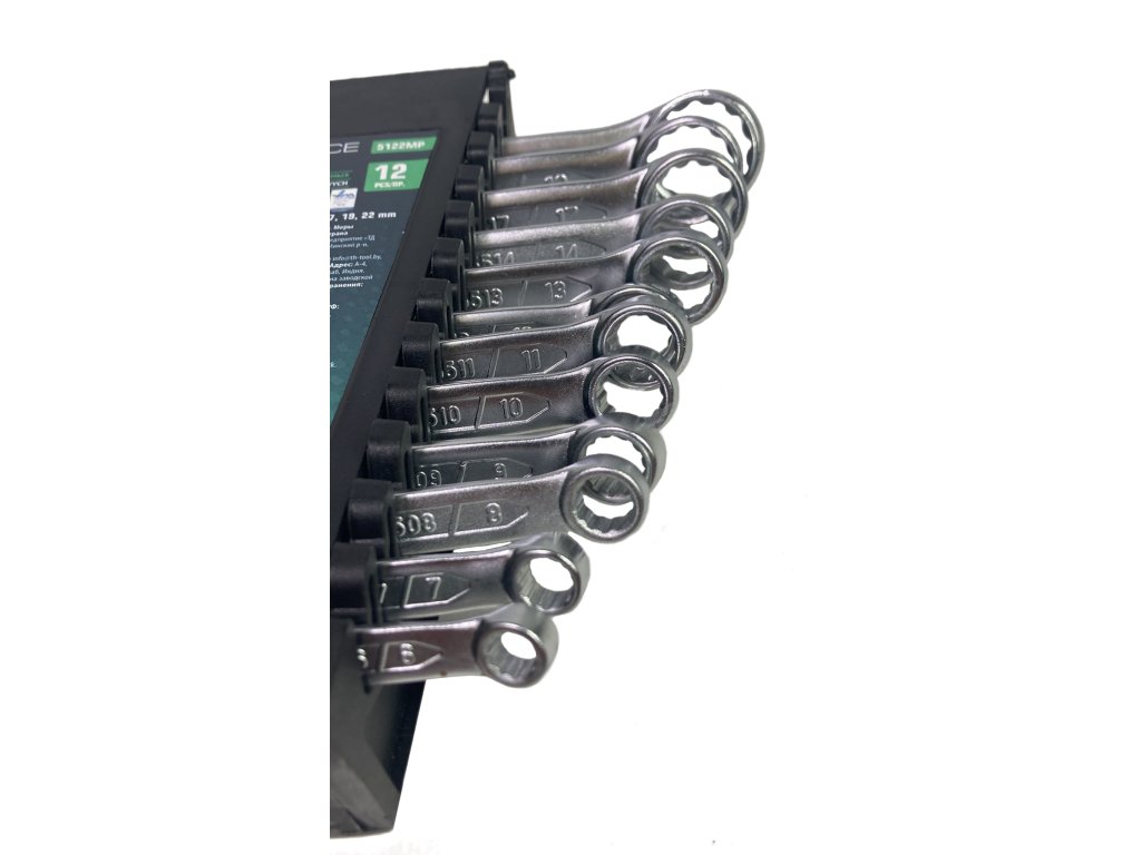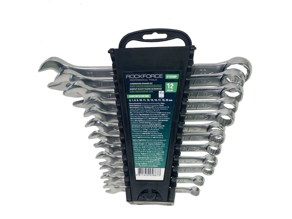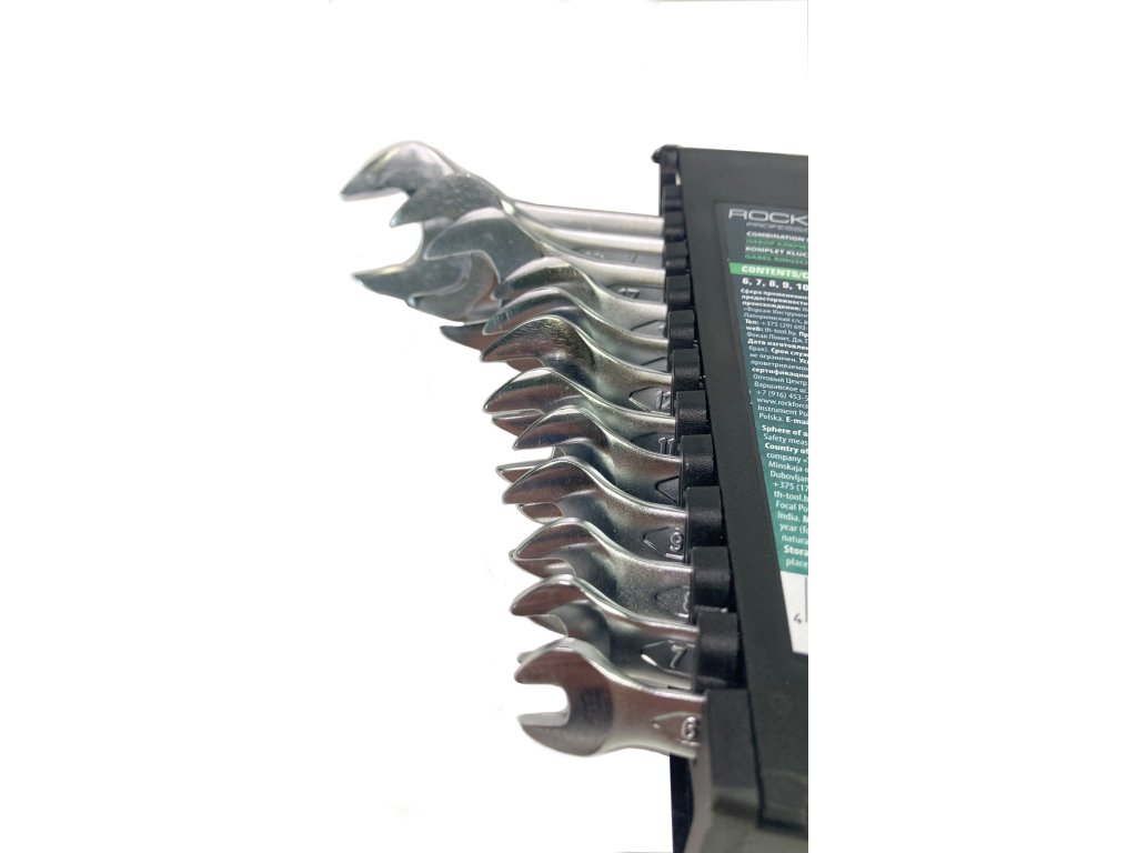 Komplet ravnih obročastih ključev znamke Rockforce. Izdelani iz jekla CrV po standardu DIN 3110. Glave ključev so polirane.