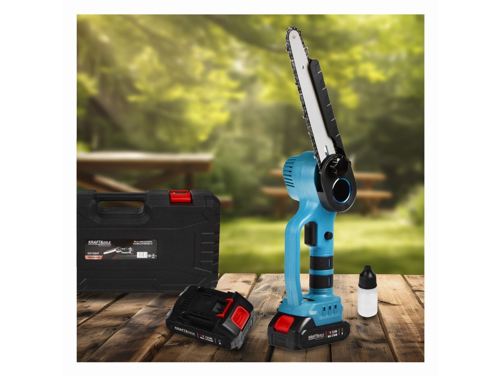 Mini aku žaga znamke Kraft&Dele, model KD10647, je idealna za obrezovanje dreves, vej in splošna vrtna opravila. Konstrukcija žage je zasnovana za udobno delo. Zaradi nizke teže in ergonomske oblike boste hitro in brez težav opravili vse v vašem vrtu, poleg tega pa boste prihranili energijo in čas.