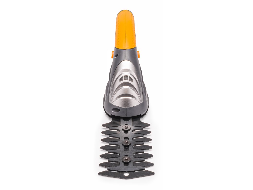 Zaradi vrtljivega mehanizma in gumba za odpiranje spodnjega pokrova lahko nože enostavno in hitro zamenjate, kar omogoča preklop iz škarij za grmičevje na škarje za travo v hipu.