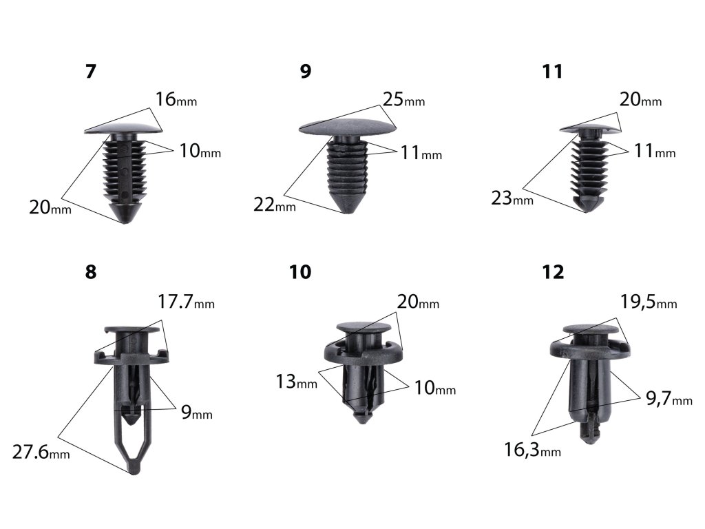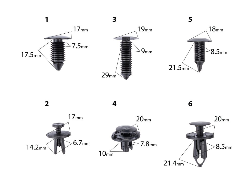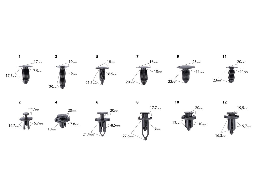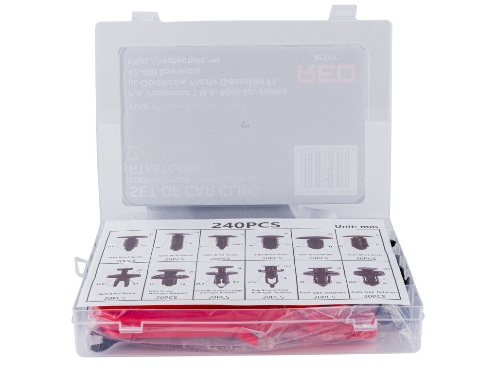 - 240 elementov v različnih velikostih in oblikah, primernih za večino modelov avtomobilov.