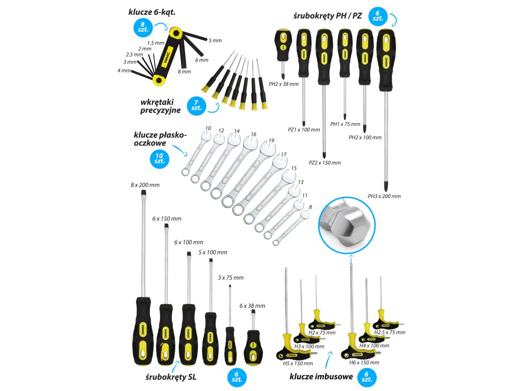 - T-imbusy (imbus ključi) – 6 kosov: H2x75 mm, H2.5x75 mm, H3x100 mm, H4x100 mm, H5x150 mm, H6x150 mm