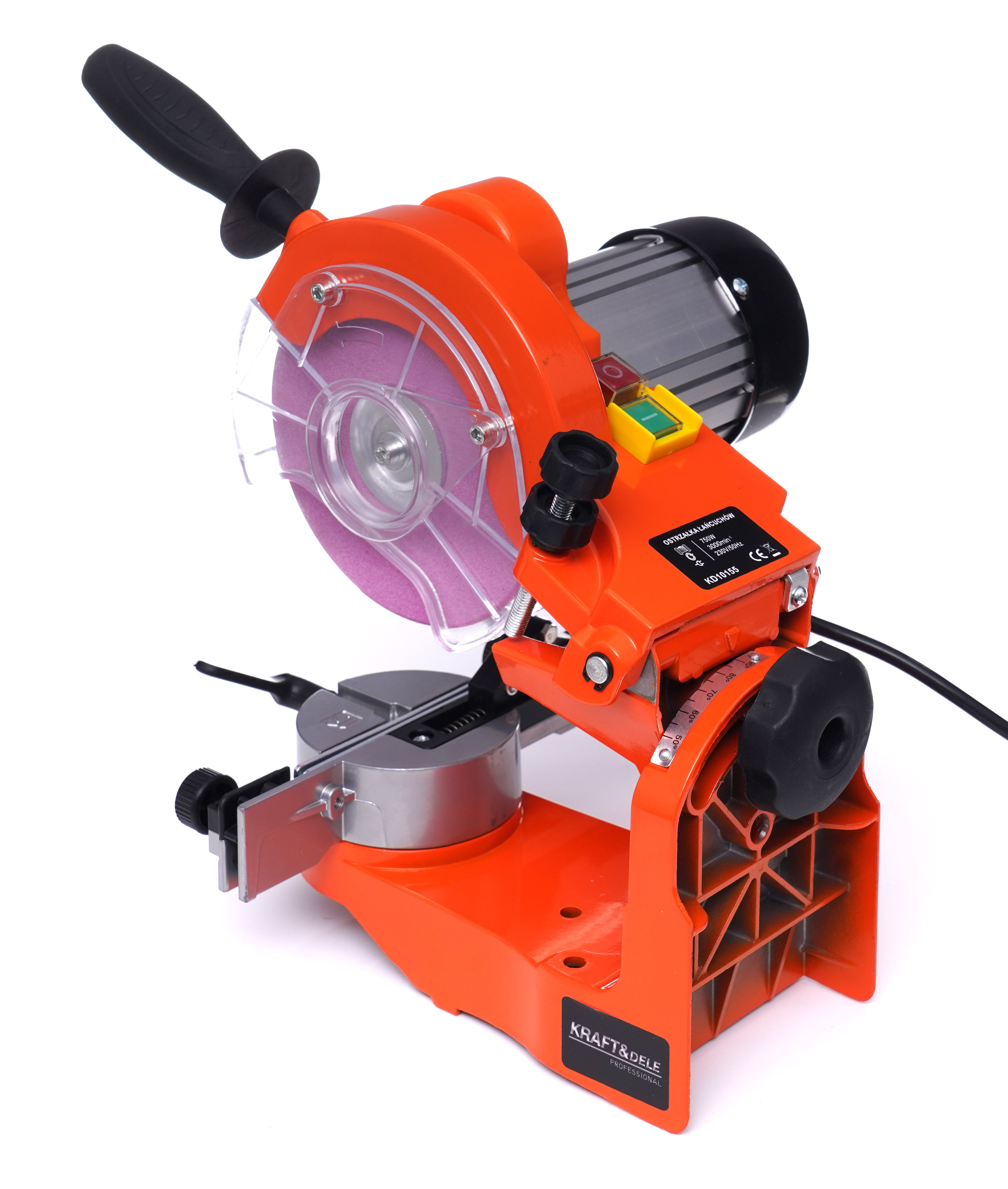 Električni brusilnik znamke Kraft&Dele, s katerim hitro in enostavno naostrite verigo motorne žage. Naprava je trdno izdelana in ima zmogljiv motor 750W.