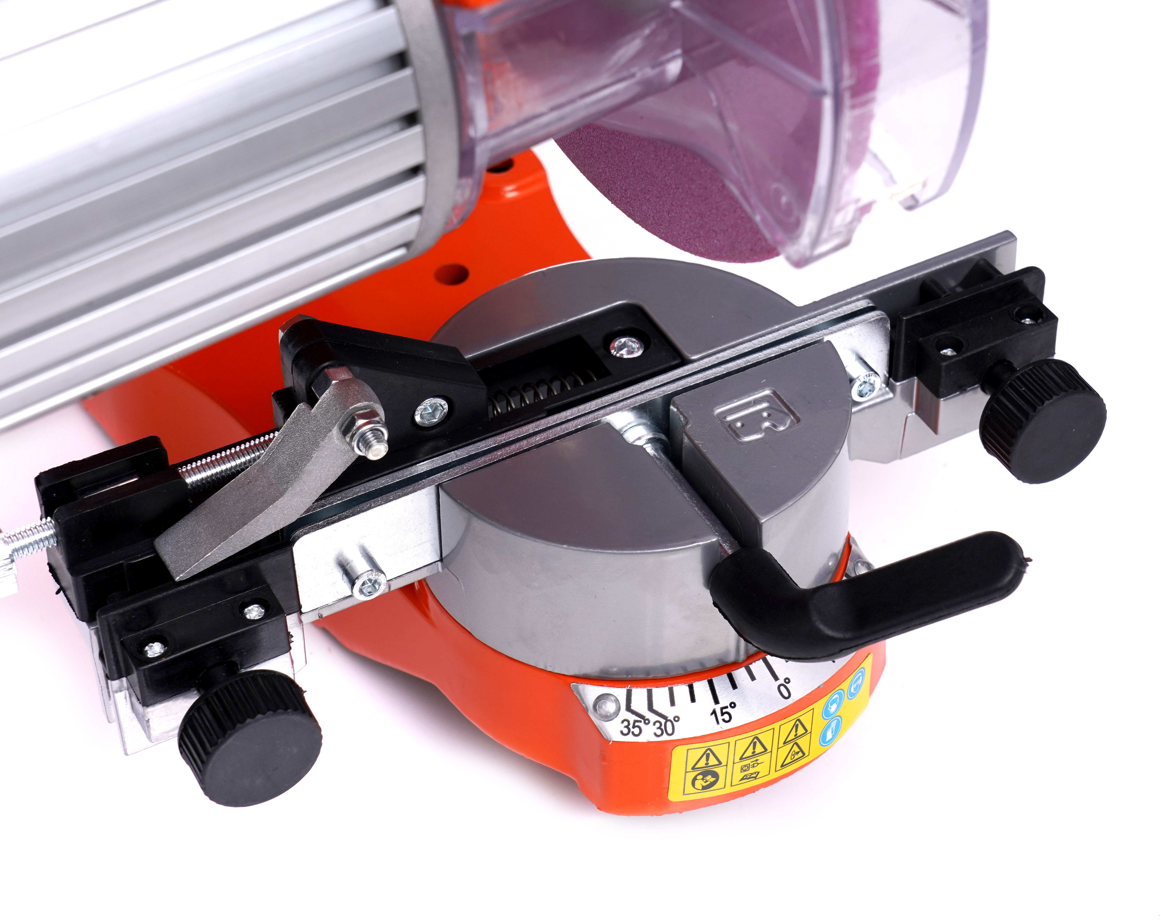 Orodje ima nagibni primež, ki omogoča brušenje verige brez potrebe po menjavi mesta pritrditve, kar zagotavlja udobje in varnost pri delu.
