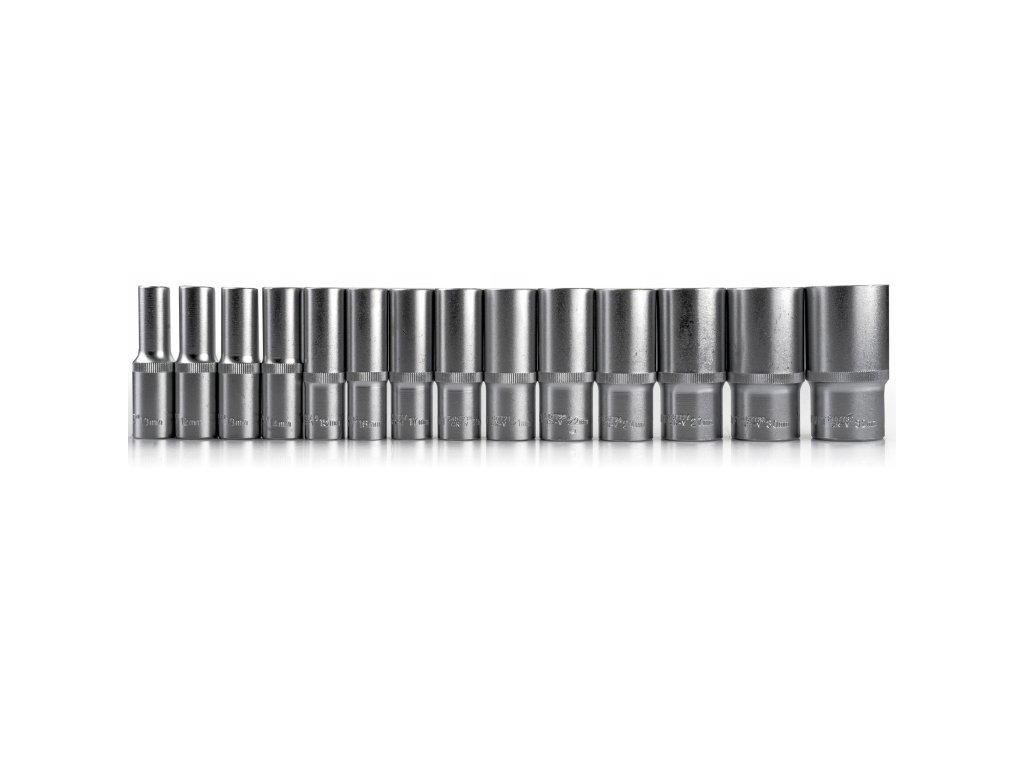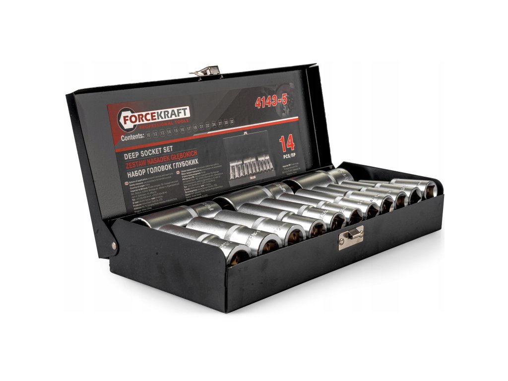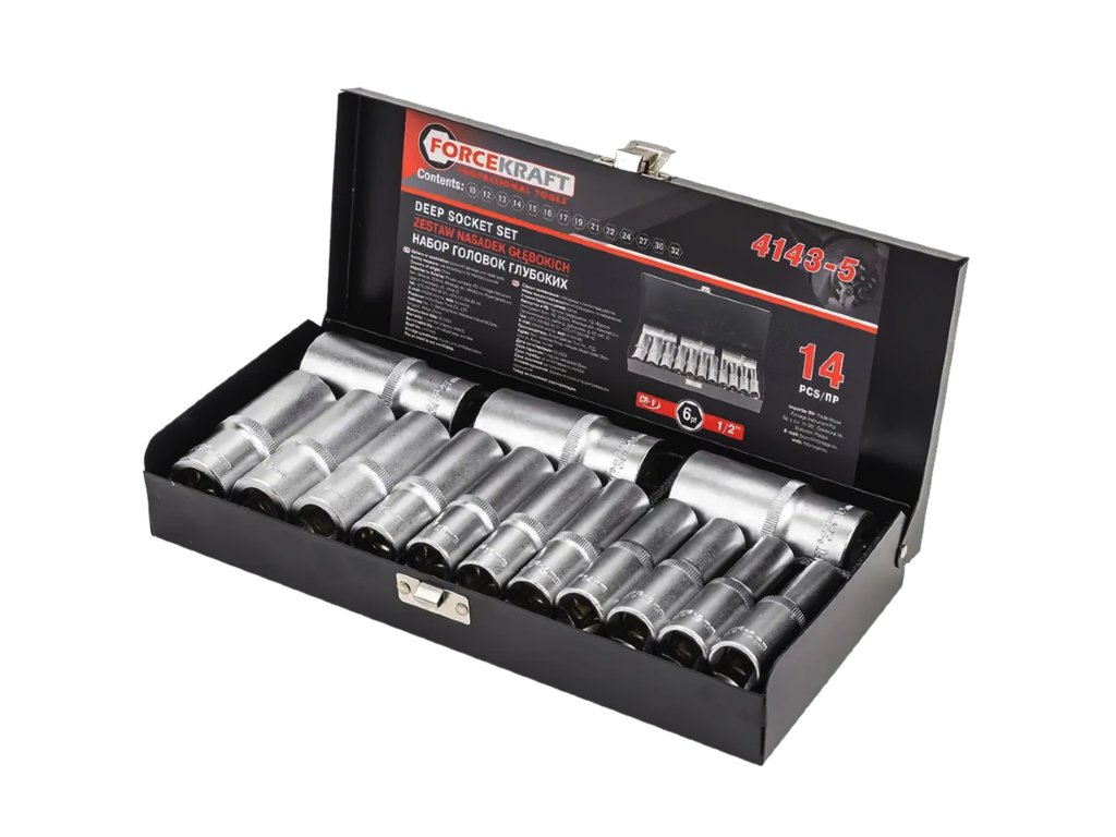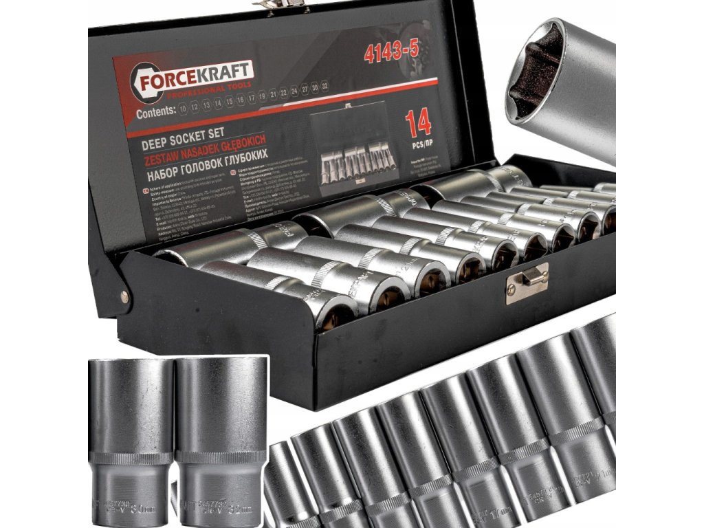 Komplet 14 globokih šestkotnih glav FORCEKRAFT je nepogrešljiv pripomoček v vsaki delavnici, bodisi profesionalni ali domači. Izdelan iz visokokakovostnega krom-vanadijevega jekla (Cr-V), odpornega proti koroziji, obrabi in visokim obremenitvam. Globoka izvedba omogoča delo z maticami in vijaki, ki so nameščeni na težko dostopnih mestih.