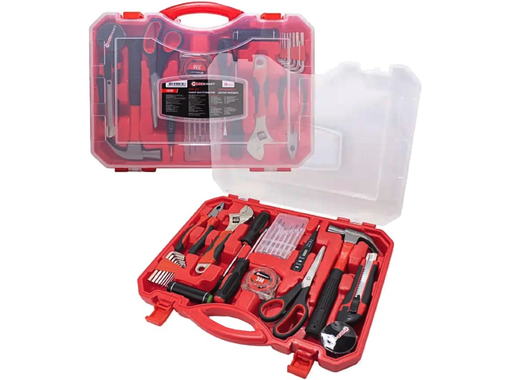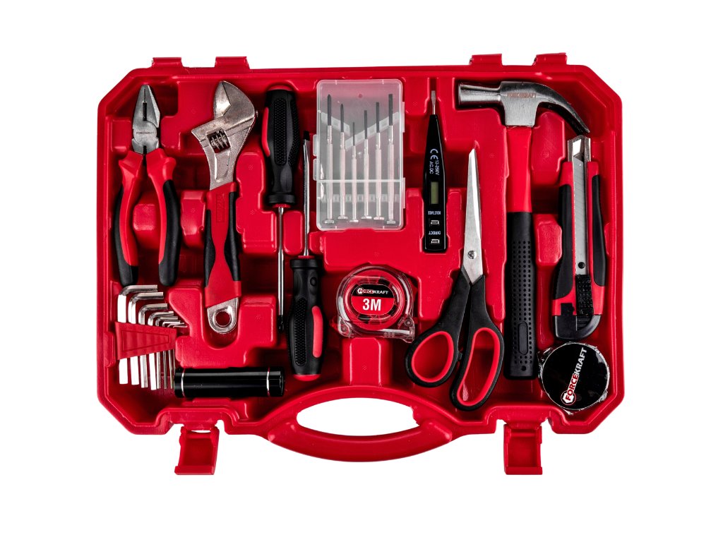 Vsa orodja so skrbno shranjena v ergonomsko in trpežnem kovčku z zaponko. Tako lahko komplet vedno imate pri roki – v avtu, doma, na gradbišču ali na vrtu.