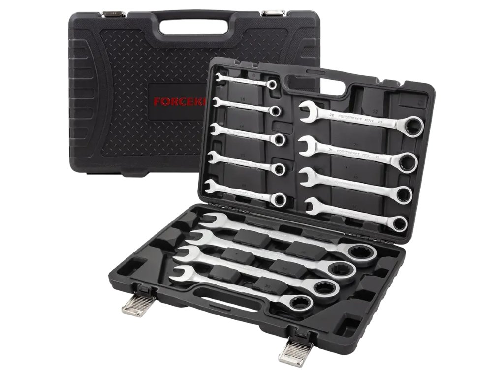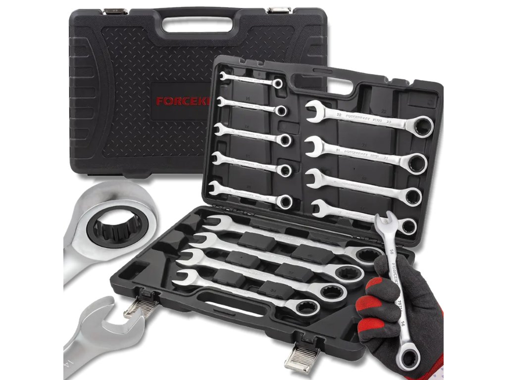 Profesionalni komplet ravnih obročastih ključev z račnovo Forcekraft je idealna rešitev za mehanike, servisne tehnike in zahtevne domače mojstre, ki zahtevajo kakovost, vzdržljivost in udobje pri delu. Zaradi kombinacije račne in natančne izdelave iz krom-vanadijevega jekla (Cr-V) se ta komplet izkaže tako v avtoservisih kot pri običajnih popravilih ali montažnih delih.
