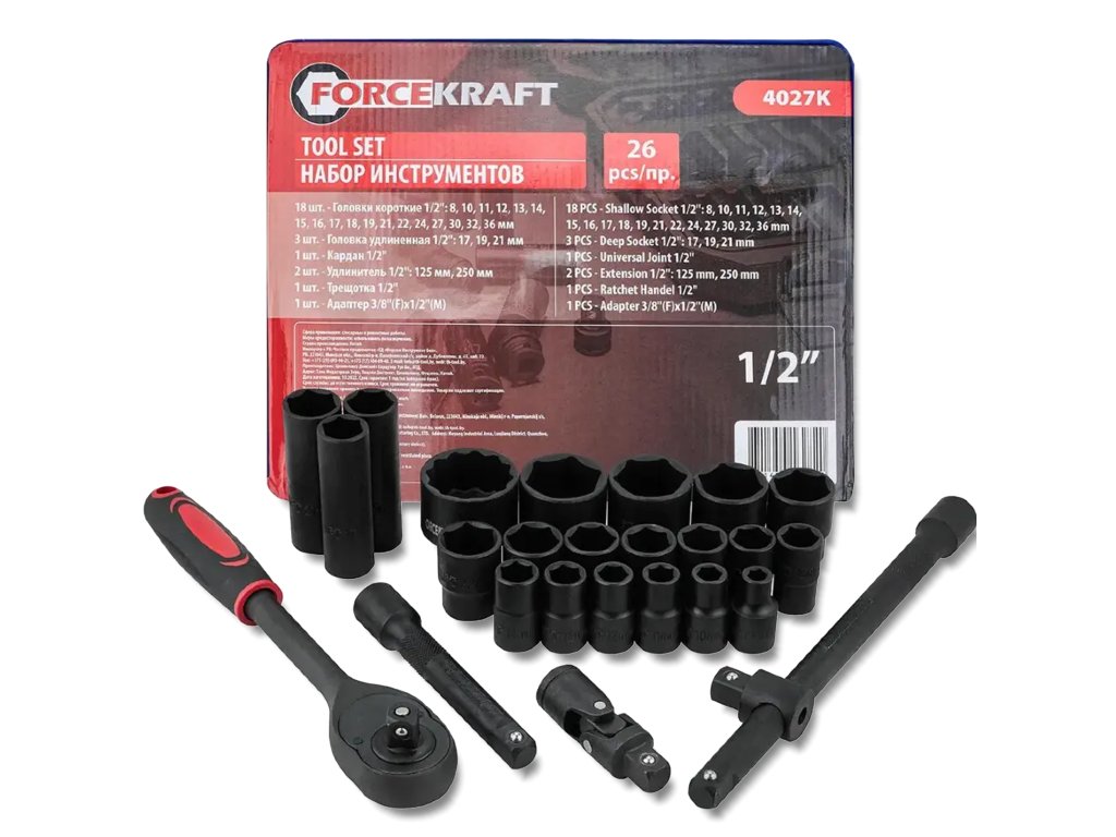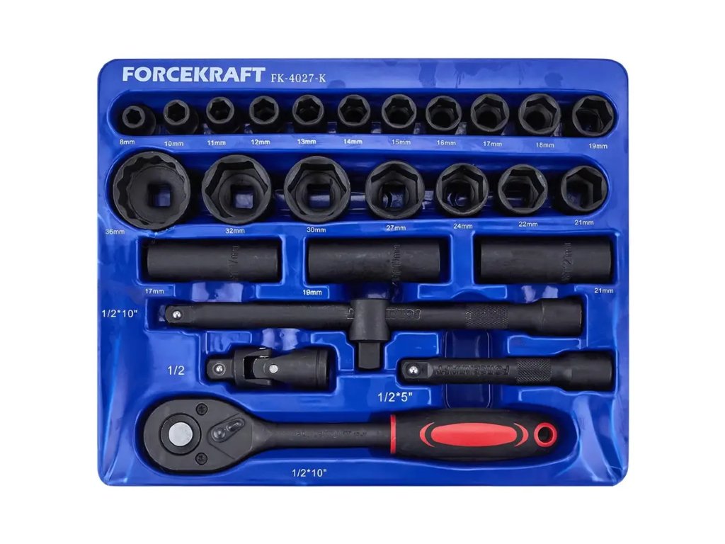 Forcekraft FK-4027-K je popoln komplet 26 kosov z vpenjanjem 1/2", zasnovan za delo v pogojih, ki zahtevajo največjo vzdržljivost. Izdelan iz visokokakovostnega krom-molibden jekla (Cr-Mo), zagotavlja odpornost proti mehanskim poškodbam in dolgo življenjsko dobo tudi pri intenzivni uporabi v avtoservisih, strojnih delavnicah ali industriji.