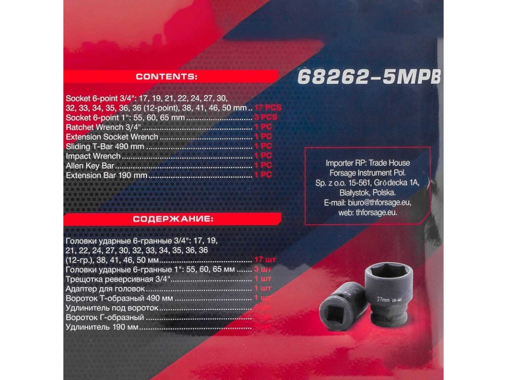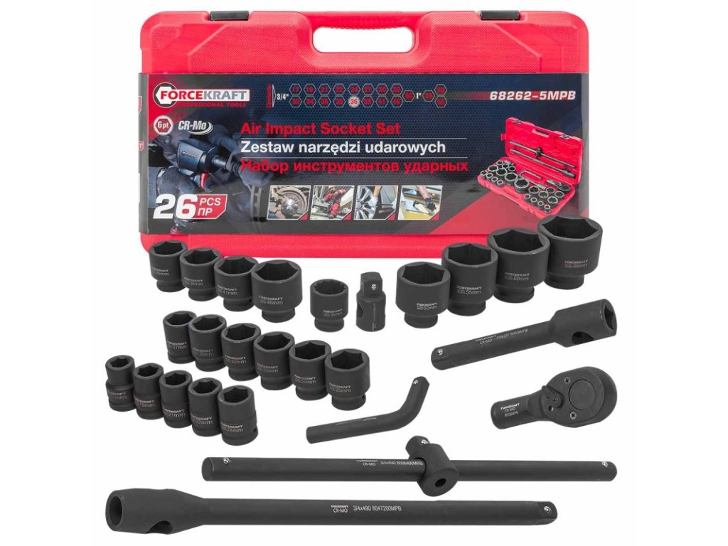 Iščete zanesljiv komplet orodja z visoko zmogljivostjo za delo z močno privitimi vijaki? Forcekraft FK-68262-5MPB je profesionalni komplet nasadnih ključev v velikostih 3/4" in 1", zasnovan za uporabo v najzahtevnejših pogojih – v težki industriji, kmetijstvu, servisih tovornih vozil in tehničnih delavnicah.