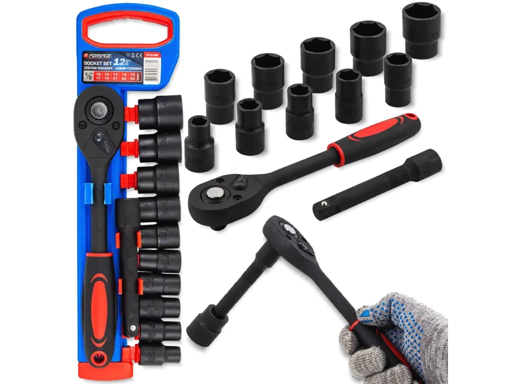 FORSAGE Komplet nasadnih ključev 1/2" 12 kosov, 10–24 mm, z račnim ključem in podaljškom