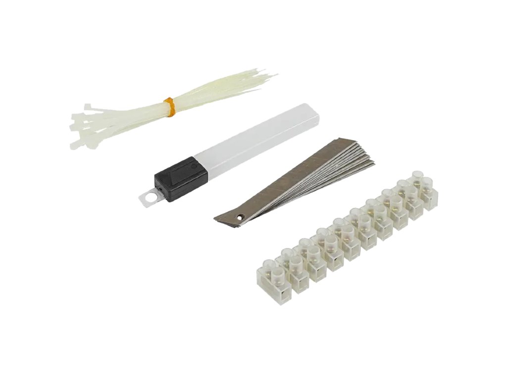- 23 kosov vezalnih trakov (pritrjevalne sponke): 2,0 x 100 mm — za organizacijo kablov, hitro vezanje elementov
