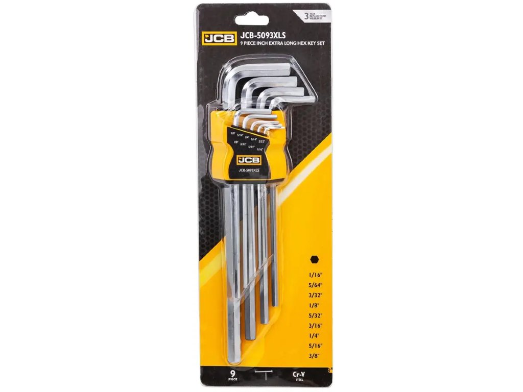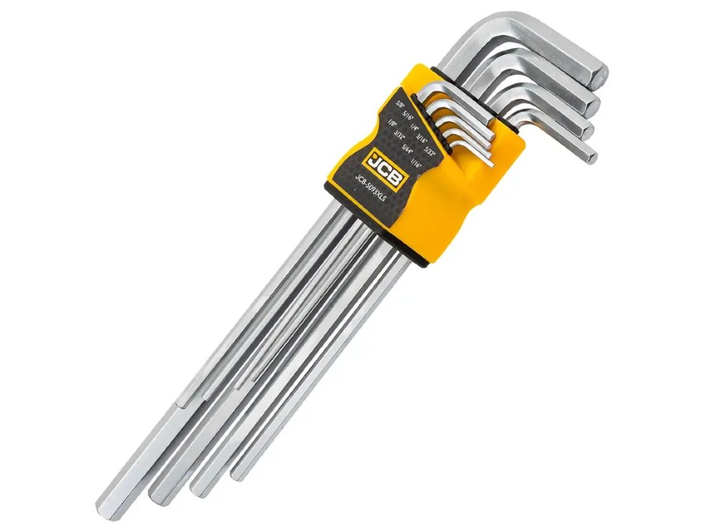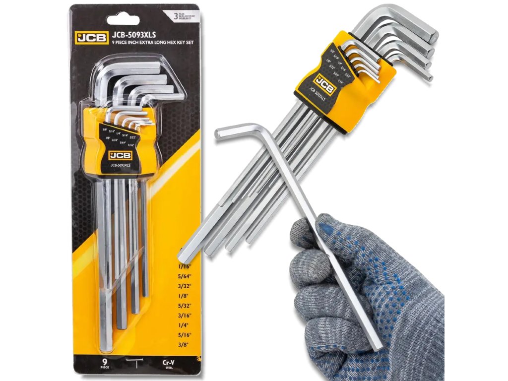 Komplet 9 kosov imbus ključev v palčnih dimenzijah JCB (JCB-5093XLS) je profesionalni nabor orodja, namenjen delu z elementi za pritrditev v imperialnem (palčnem) standardu, ki se pogosto uporablja v industrijskih strojih, ameriški opremi, elektroniki in specializiranih kolesih.