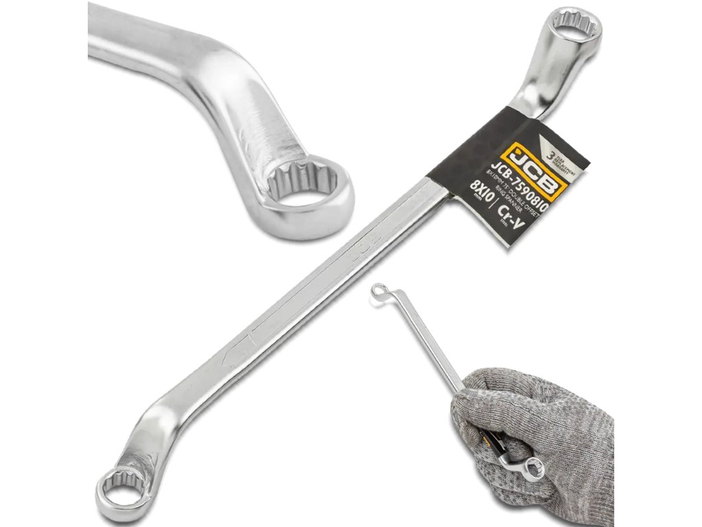 JCB dvojni 12-kraki obročni ključ, ukrivljen za 75°, 8 × 10 mm, Cr-V