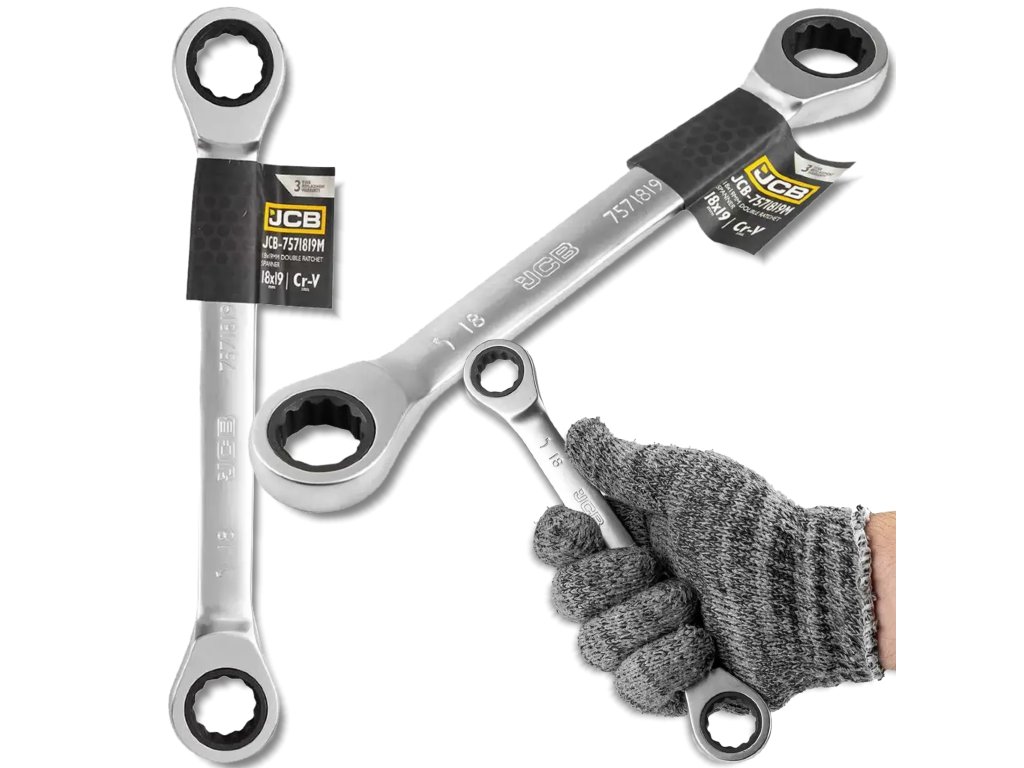 JCB Dvostranski obročasti ključ z račko 18 × 19 mm, Cr‑V, 12-kraki