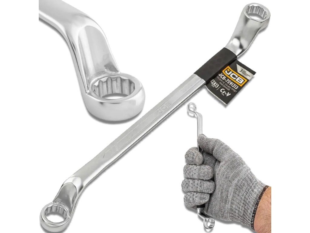 JCB obojestranski obročni ključ, ukrivljen za 75°, 12x13 mm, Cr-V, 12-kraki