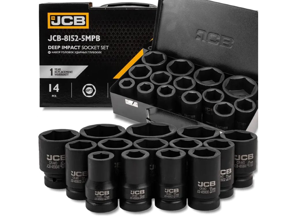 Komplet 14 globokih udarnih nasadnih ključev JCB Tools je profesionalno orodje namenjeno intenzivnim delavnicam, vključno z montažo in demontažo vijakov ter matic z uporabo udarnih vijačnikov.