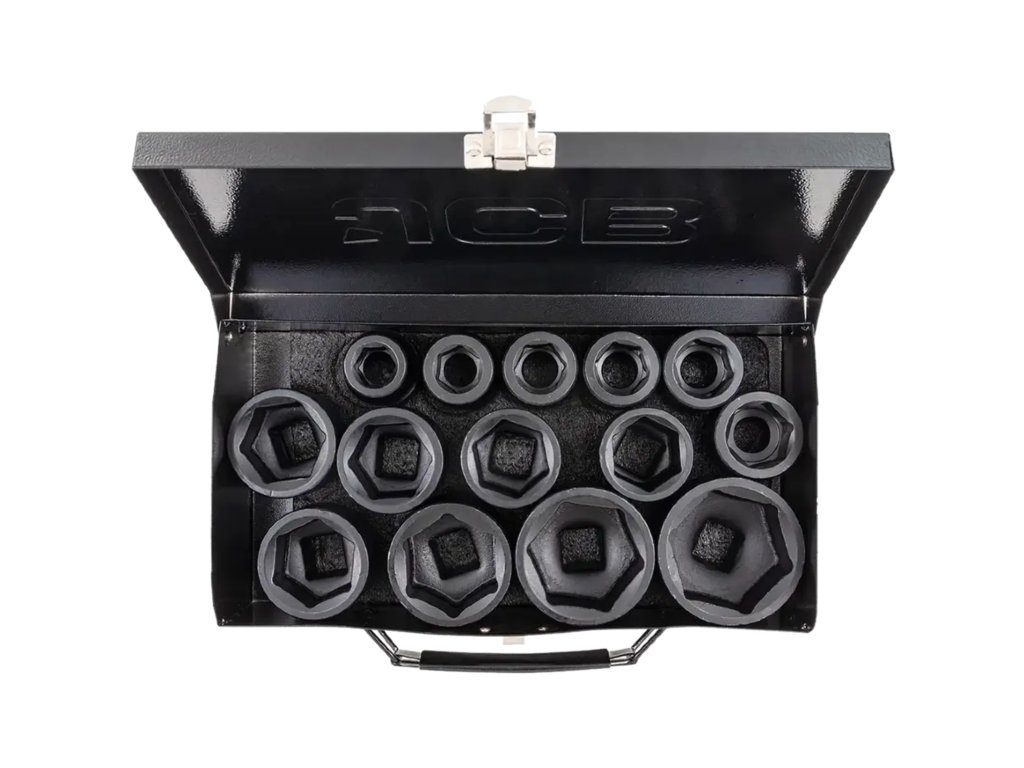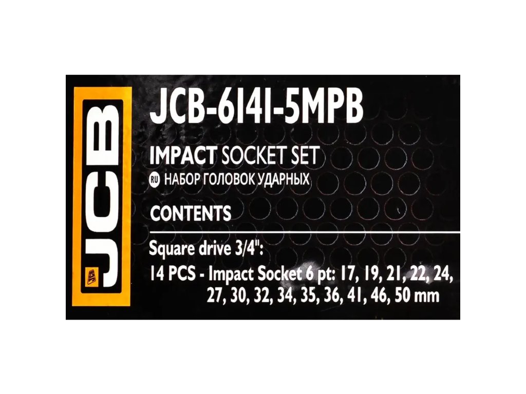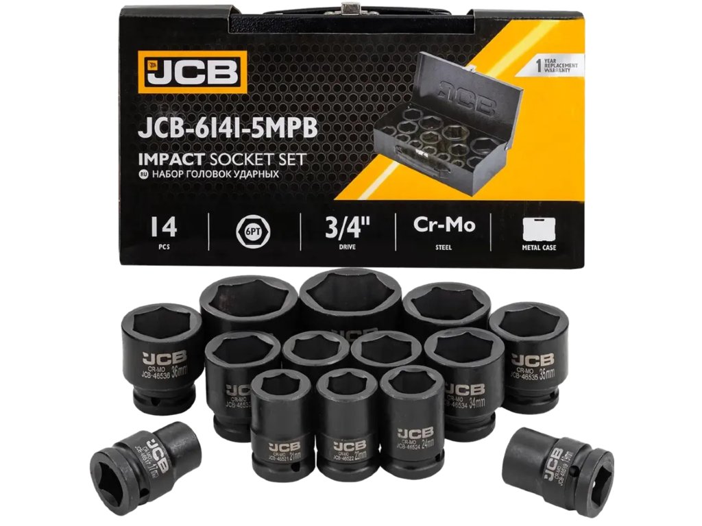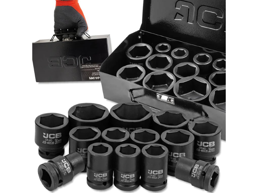 JCB-6141-5MPB je popoln komplet 14 udarnih nastavkov, namenjen najzahtevnejšim opravilom v avtomehaničnih delavnicah, delavnicah in pri montažnih delih. Izdelani iz visoko trdnega krom-molibdenovega jekla (Cr-Mo) zagotavljajo izjemno odpornost proti razpokam, udarcem in deformacijam tudi pri delu z udarnimi ključi (pnevmatskimi ali električnimi).