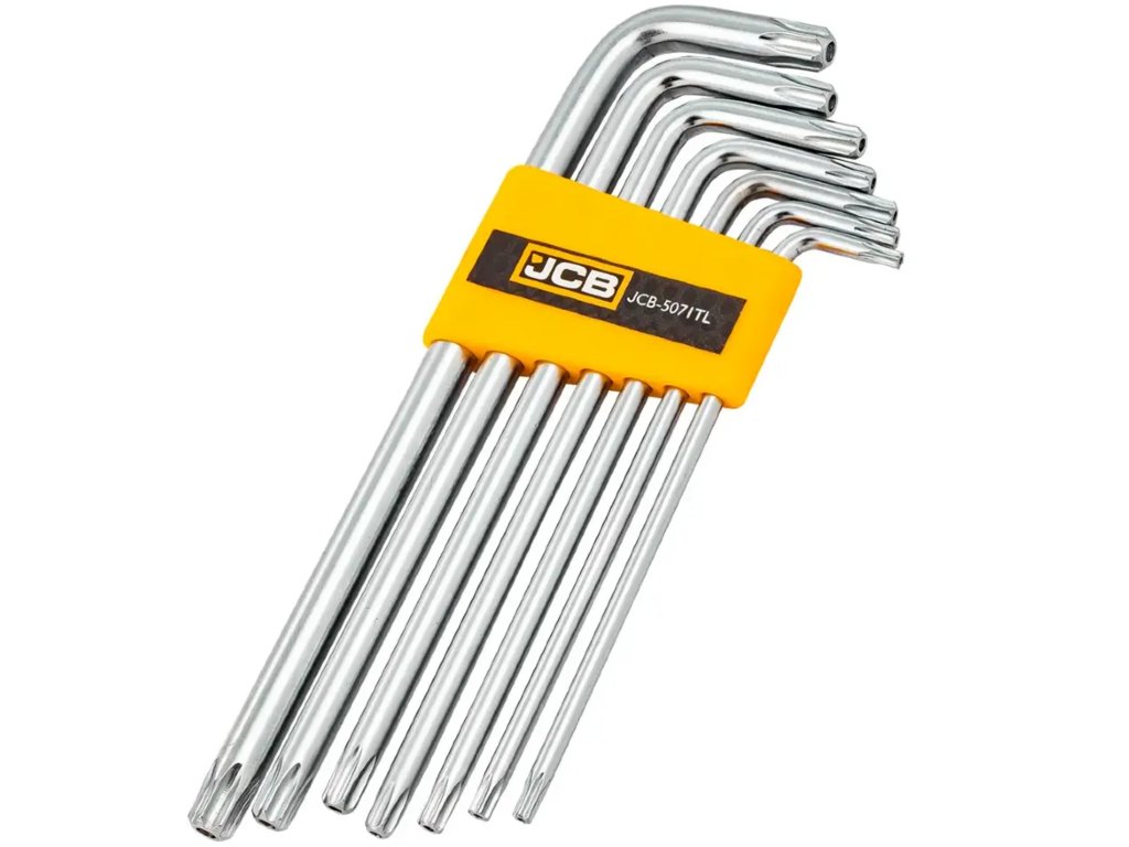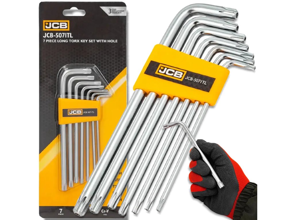 Komplet 7 dolgih TORX ključev z luknjo (varnostni TORX, tip H/TN) znamke JCB je nepogrešljivo orodje za delo s komponentami zaščitenimi z varnostnimi vijaki. Zaradi prisotnosti luknje na gredi (sredi konice) ključi omogočajo privijanje in odvijanje posebnih varnostnih vijakov, ki se uporabljajo npr. v elektroniki, alarmnih sistemih, industrijski avtomatizaciji, servisiranju gospodinjskih aparatov in v prometnih sredstvih.