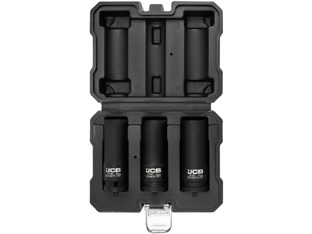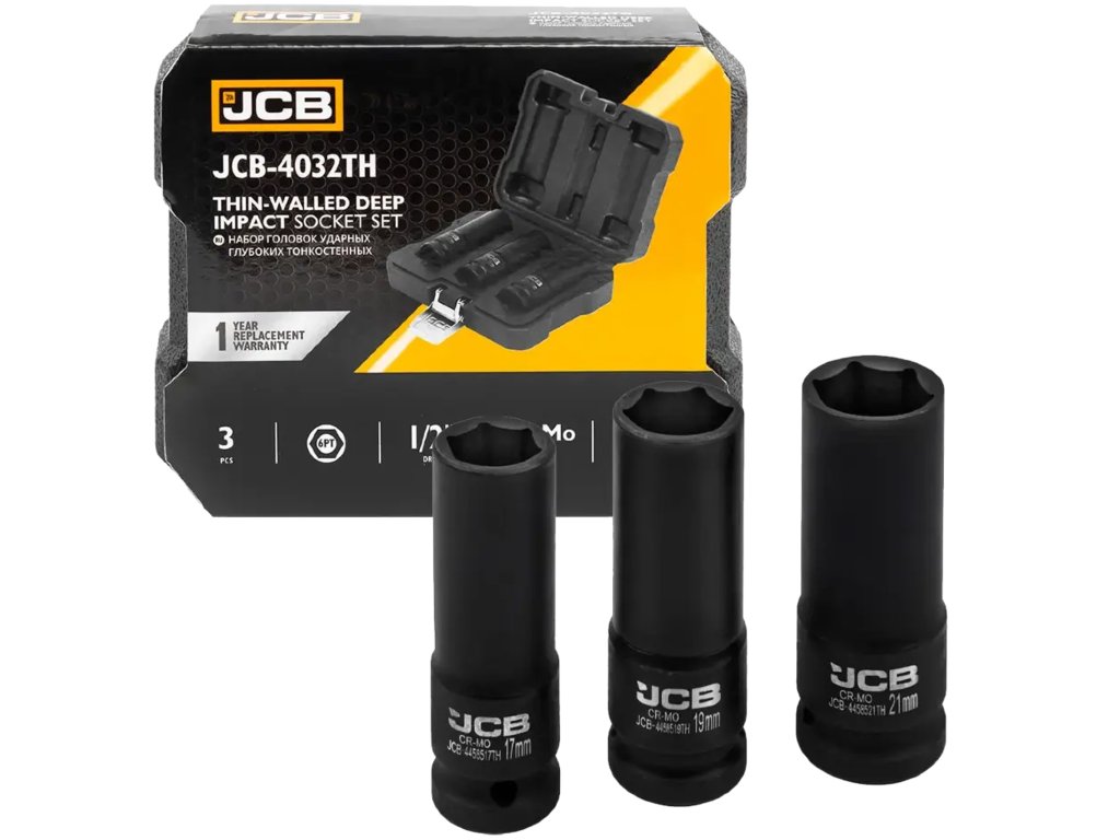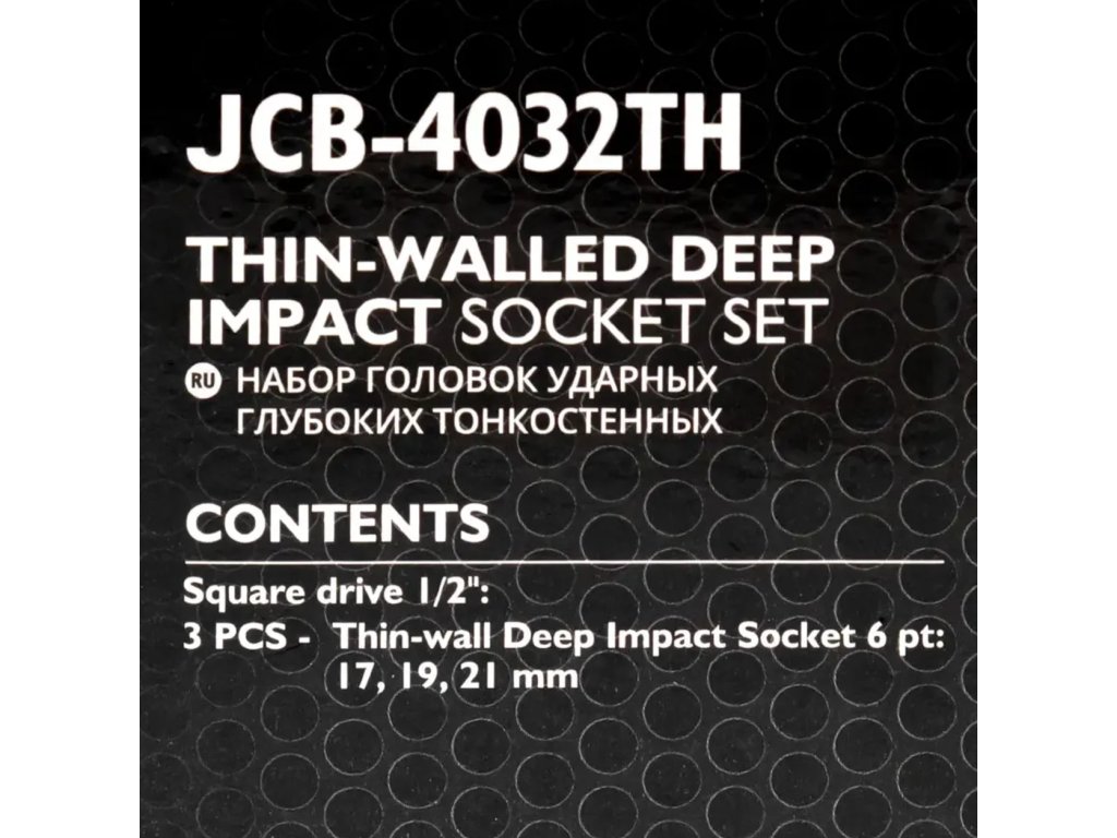 JCB-4032TH je komplet 3 profesionalnih tankostenskih udarnih nastavkov z podaljšanim profilom, zasnovan za zahtevne delavnice in industrijske aplikacije. Namenjen je delu z udarnimi vijačniki in račnimi ključmi z vpenjanjem 1/2". Nastavki nudijo izjemno odpornost, natančno prileganje na vijake in matice ter možnost dela na težko dostopnih mestih – na primer pri aluminijastih platiščih ali globoko vgrajenih vijakih.