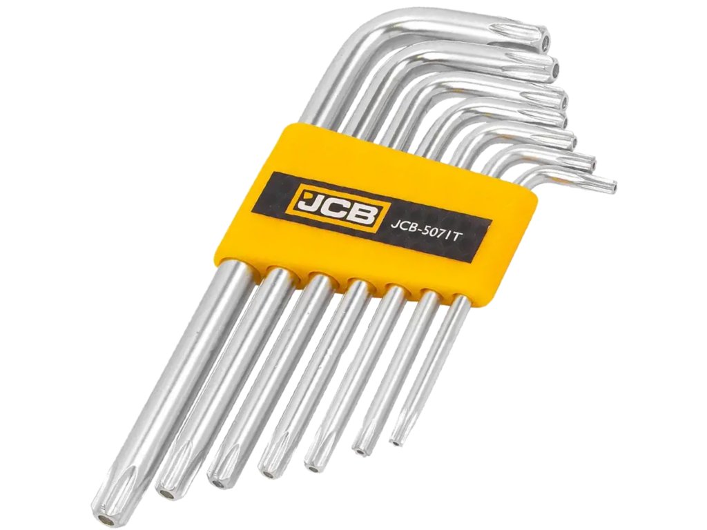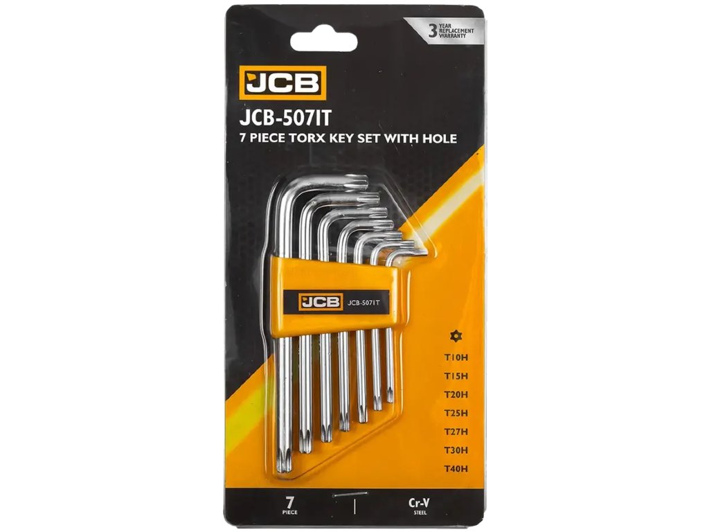 Komplet 7 TORX ključev z luknjo (varnostni TORX, tip H/TN) znamke JCB so nepogrešljiva orodja za delo z elementi zaščitenimi pred manipulacijo. Zaradi prisotnosti luknje na konici (v sredini konice) ključi omogočajo privijanje in odvijanje posebnih varnostnih vijakov, ki se uporabljajo npr. v elektroniki, alarmnih sistemih, industrijski avtomatizaciji, servisiranju gospodinjskih aparatov in v avtomobilih.