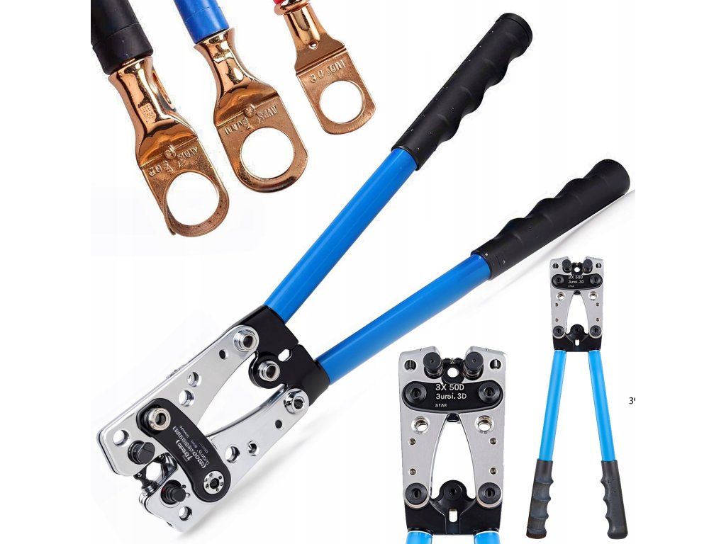 Klešče so prilagojene za končnike iz bakra in aluminija, omogočajo hitro in zanesljivo povezavo vodnikov s šestkotno (HEX) stiskalno matico. Mehanizem z dvema ergonomskima ročajema zagotavlja visoko silo pri minimalnem naporu.