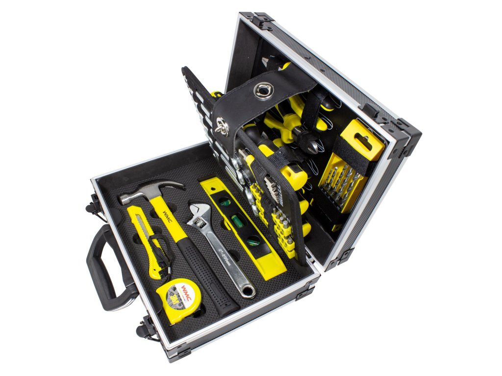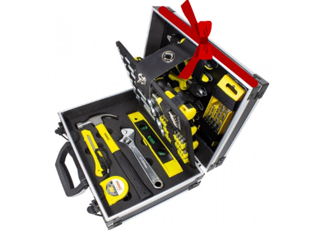 Popoln 64-delni komplet orodja shranjen v praktičnem kovčku – idealno kot darilo za mojstre in domačo uporabo. Robustna izdelava orodij in pregledna razporeditev v kovčku zagotavljata enostaven dostop in varno shranjevanje.
