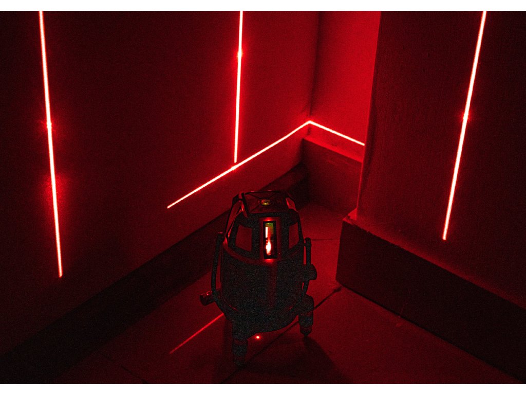 - Križni laser generira en horizontalni žarek in štiri vertikalne žarke, ki se sekajo pod kotom 90°.