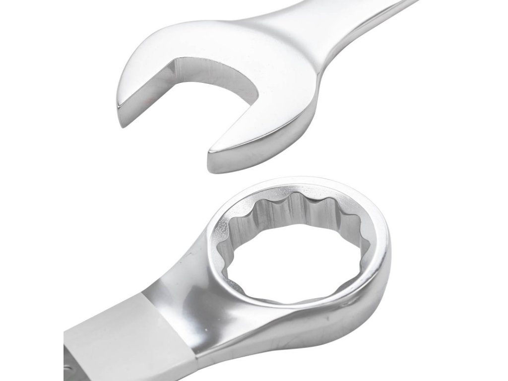 Obročasti ravni ključ, odsoten za 15°, izdelan iz jeklene ogljikove, površina orodja kromirana, satenasta.