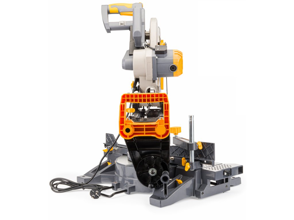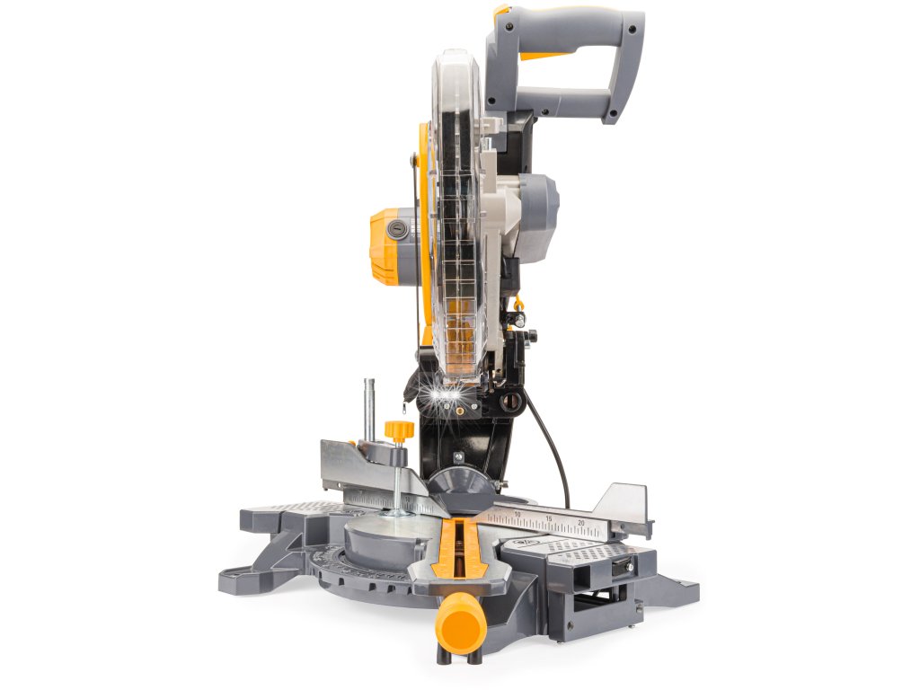 Naprava ima vrtljivo mizo z možnostjo nastavitve kota in zložljivo ploščo z nastavitvenim razponom 0 - 45°, kar omogoča udobno delo z različnimi vrstami materialov. Na voljo je tudi vodilna letvica in primež za varno in čisto rezanje. Poševna žaga lahko reže tudi aluminij in plastiko, če uporabite ustrezen rezalni disk.