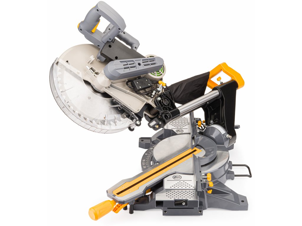 Naprava omogoča hitro in natančno rezanje lesa, desk in plošč. Dvojno poševno rezanje je enostavno zaradi zložljive in vrtljive glave. Žaga je opremljena z zmogljivim motorjem z največjo močjo 2200 W in enostavno zamenljivimi krtačami. Laserski vodilni element povečuje udobje in natančnost dela. Napajanje poteka preko električnega omrežja.