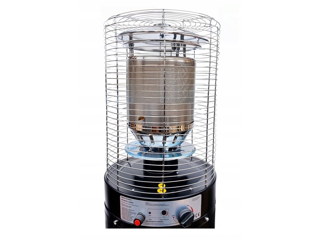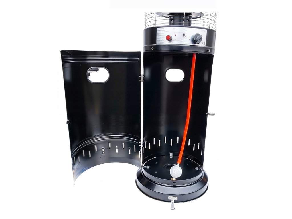 Naprava je opremljena z elektronskim vžigom in varnostnimi elementi, vključno z zaščito proti prevrnitvi in uhajanju plina, kar zagotavlja varen in zanesljiv obratovanje. Zaradi vgrajenih koles je rokovanje z grelnikom enostavno in priročno.