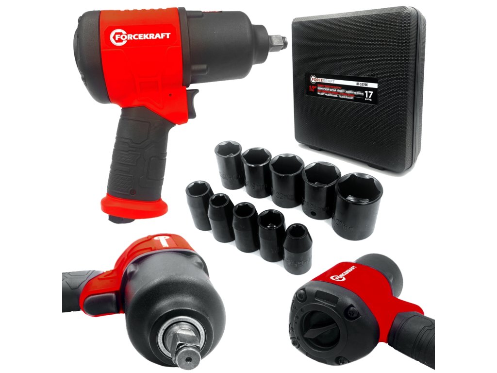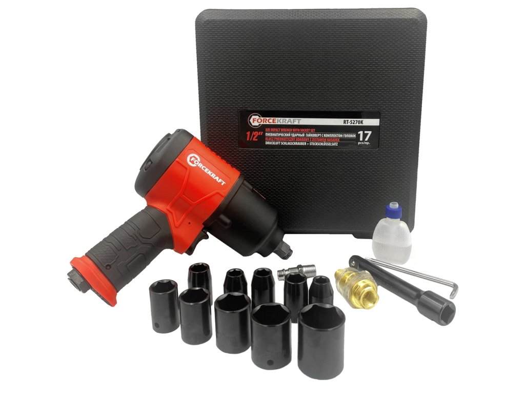 - komplet udarnih glav 1/2" – 10 kosov: 9 mm, 10 mm, 11 mm, 13 mm, 14 mm, 17 mm, 19 mm, 22 mm, 24 mm, 27 mm