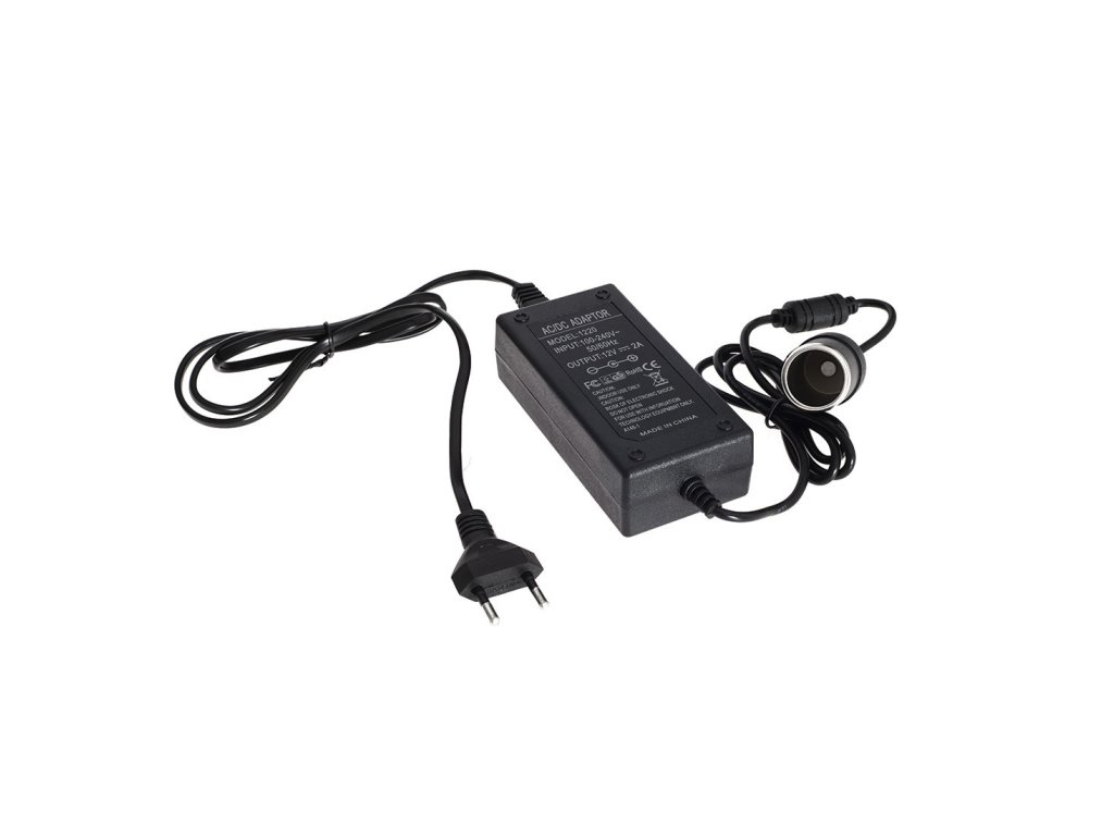 V paketu prejmete: omrežni adapter 230V in adapter za baterijo - vtič v avtomobilski ključ z krokodilskimi sponkami, adapter 12V.