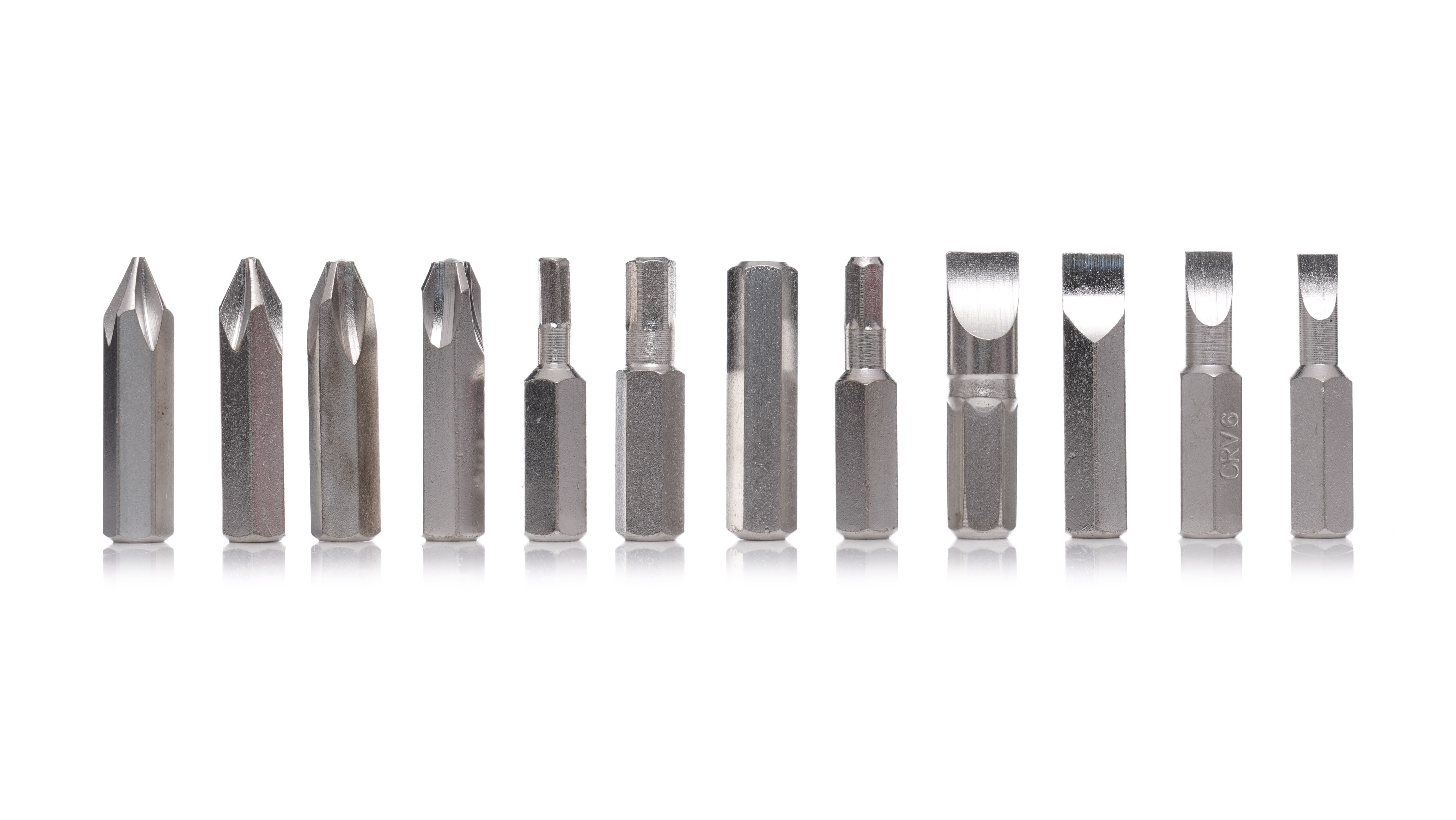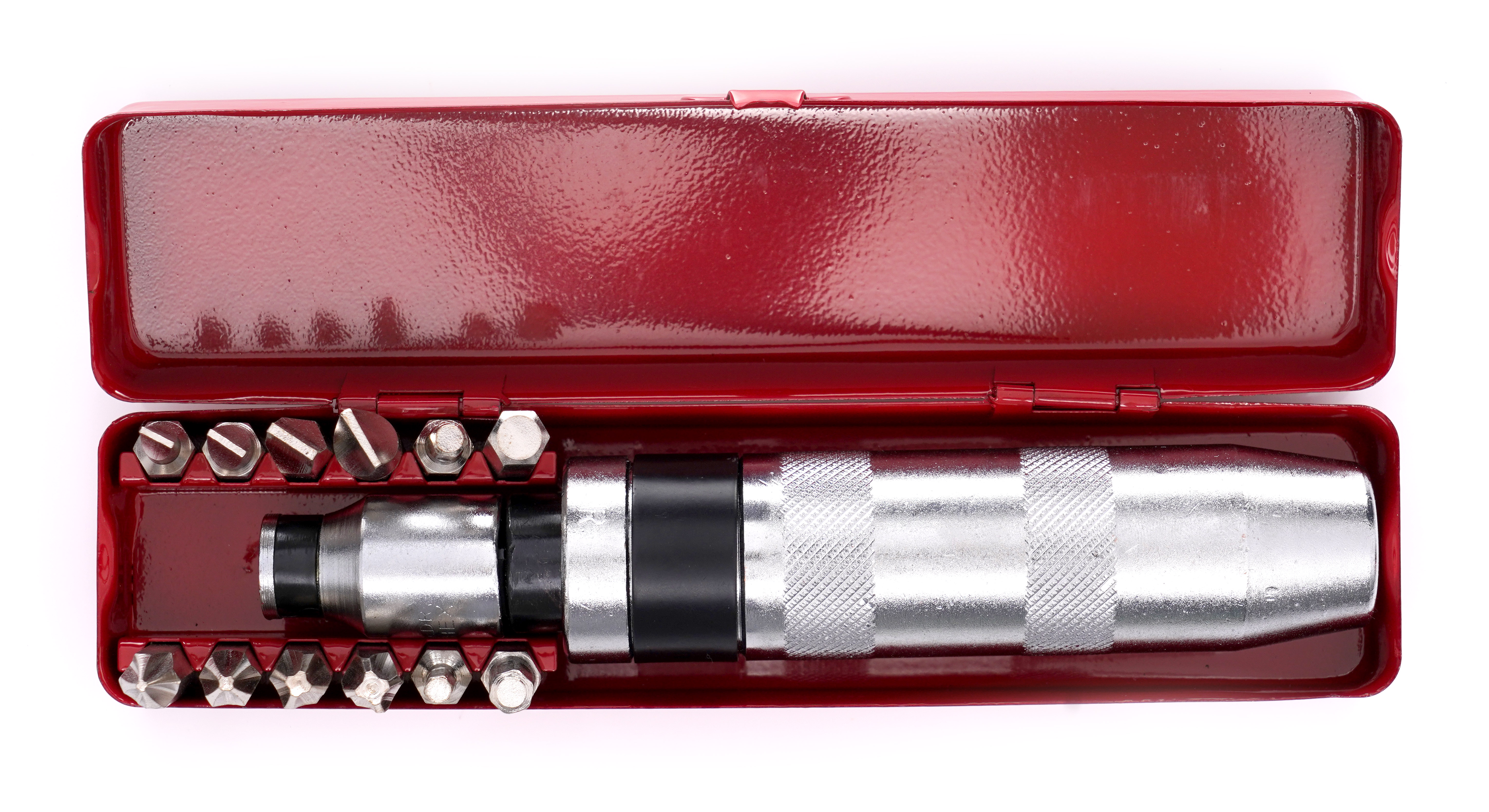 Komplet vsebuje univerzalni nosilec, na katerega se na koncu pritrdijo zamenljivi nastavki z možnostjo nastavitve smeri vrtenja desno/levo.