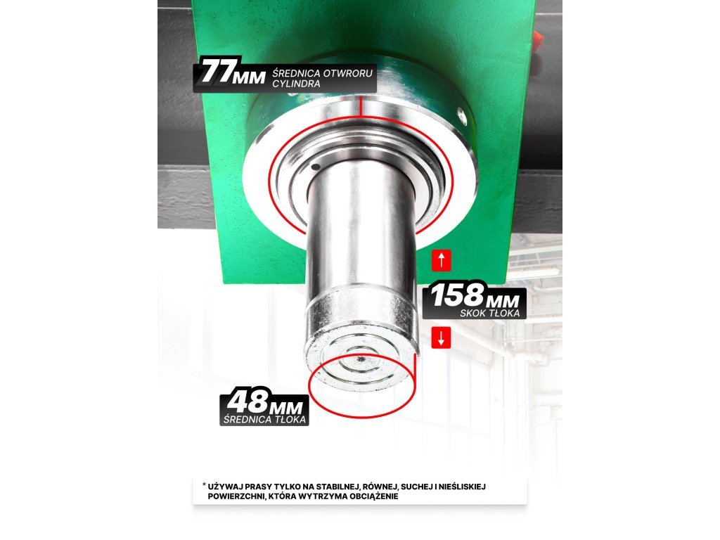 Pritisk na ravni 20.000 kg omogoča brez težav obdelovati najtežje kovinske dele, strojne komponente ali avtomobilske sestavne dele. Idealno za stiskanje in iztiskanje ležajev, čepov, ležišč ali delov vzmetenja.
