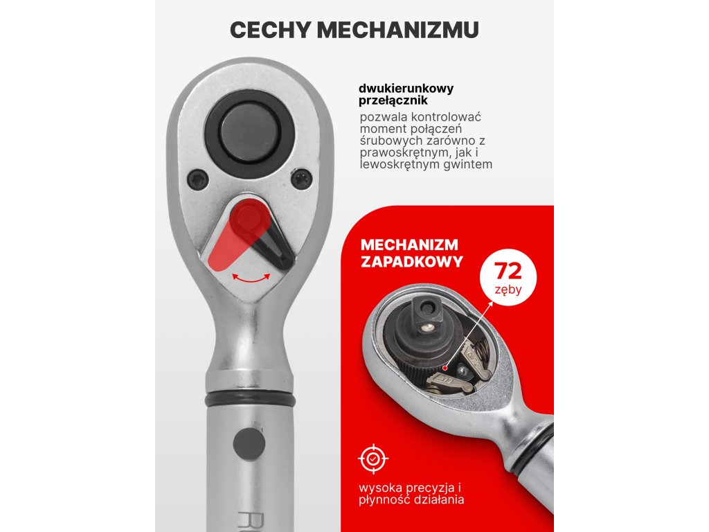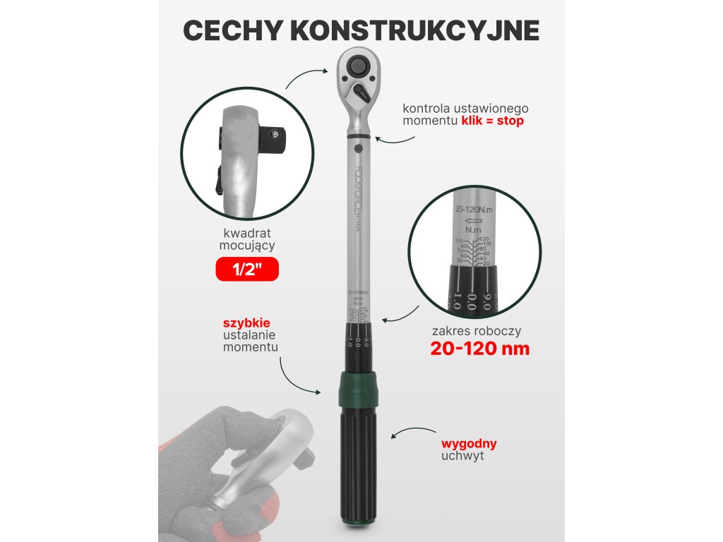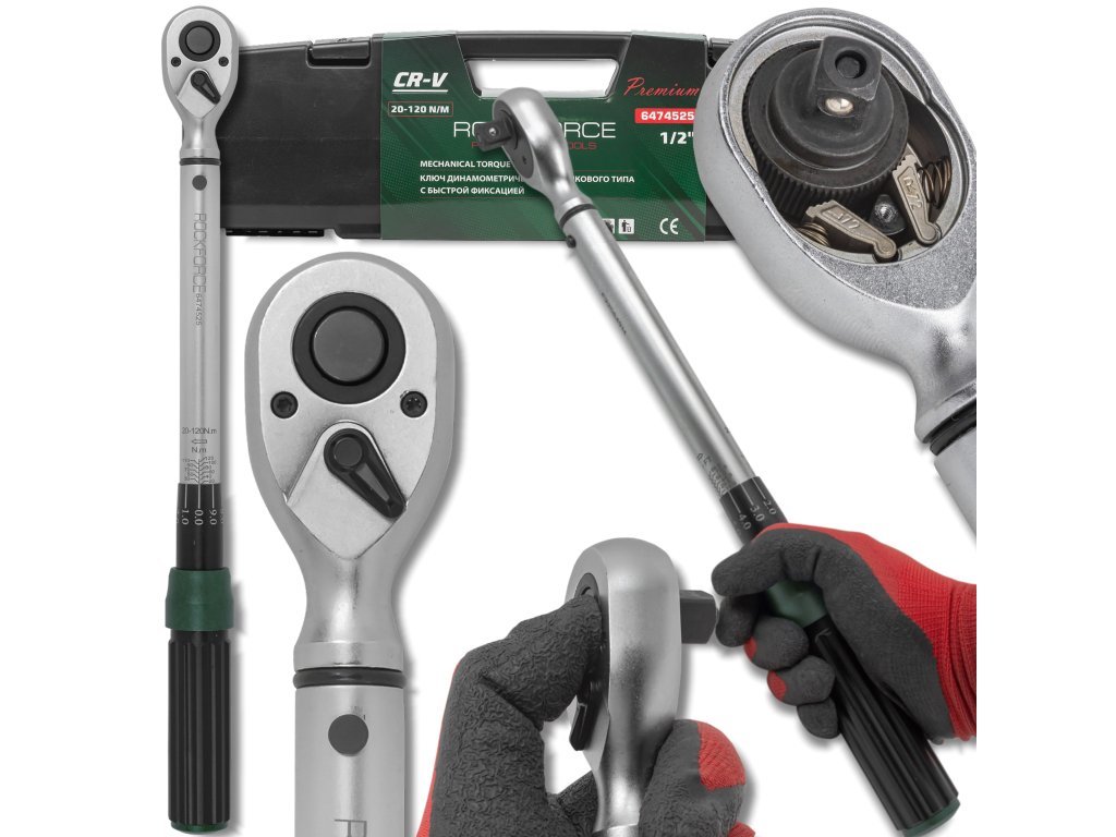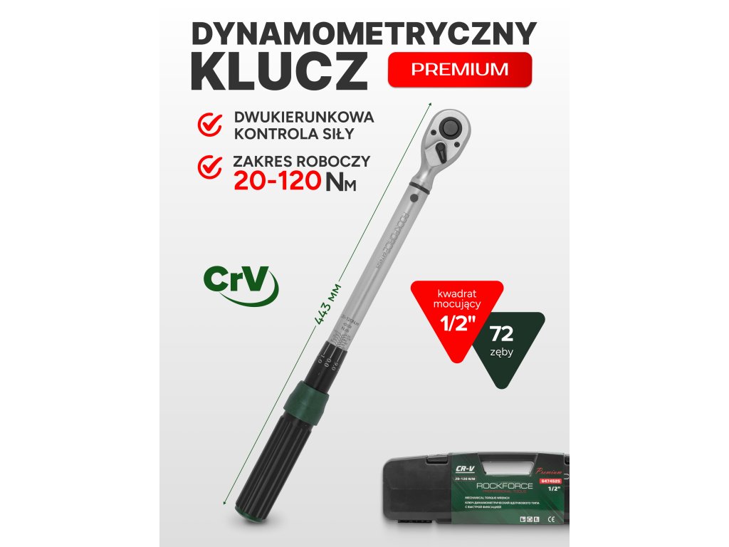 Profesionalni momentni ključ ROCKFORCE Premium 1/2" je orodje zasnovano za natančno privijanje vijakov in matic na zahtevani navor. Zaradi območja 20–120 Nm, trdne konstrukcije iz krom-vanadijevega jekla CR-V in natančnega ratchet mehanizma (72 zob) orodje zagotavlja natančnost, varnost in udobje pri delu v vseh pogojih.
