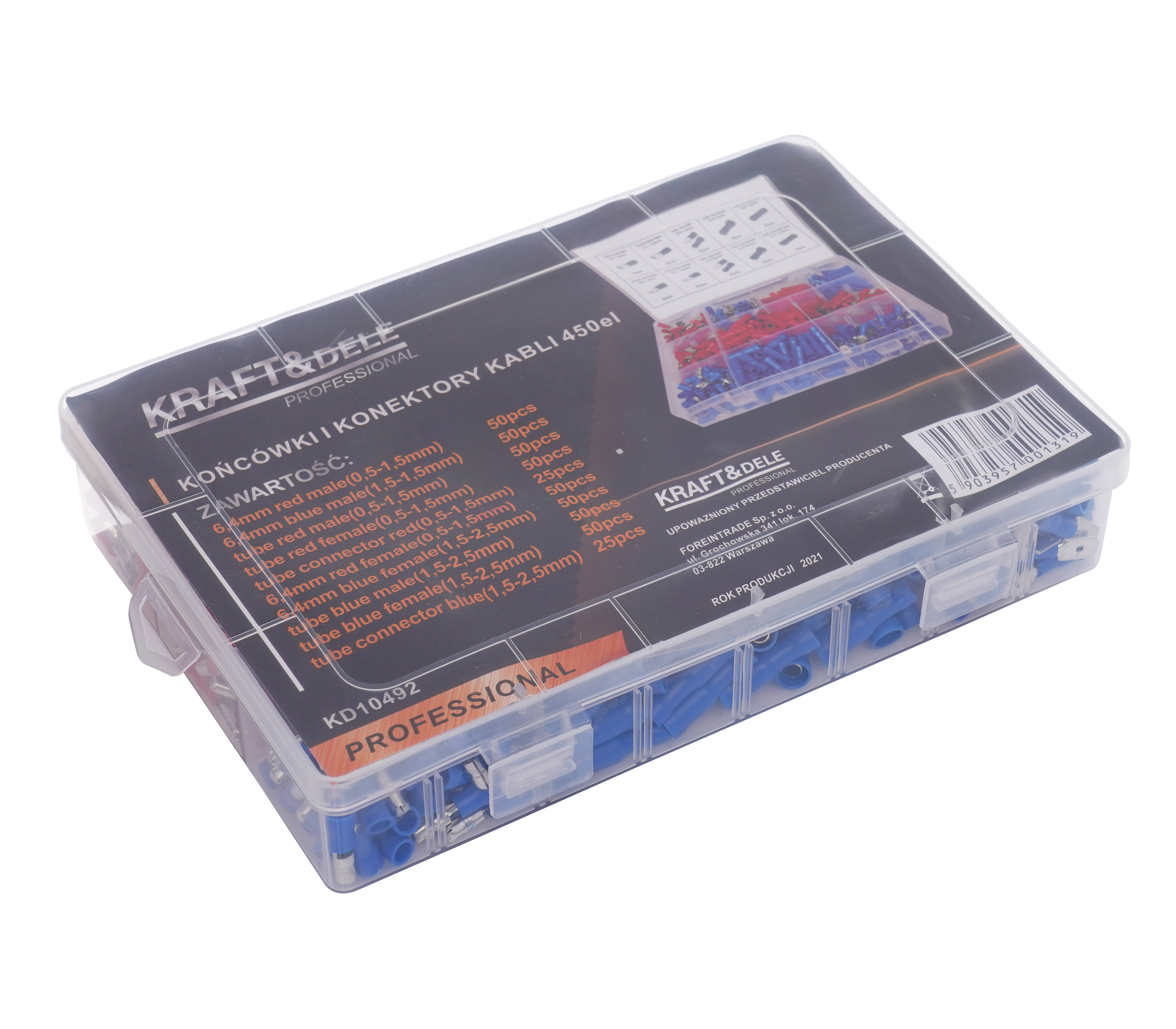 Avtomobilski konektorji - ženski, moški in cevni znamke Kraft&Dele, model KD10492, dobavljeni v praktični trdni embalaži, ki olajša sortiranje posameznih vrst konektorjev. Konektorji služijo za povezavo kablov z električnimi napravami, drugimi kabli itd.