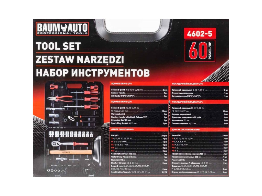 - Izvijači: ravni SL 5×150 mm, križni PH1 × 75 mm, ravni SL 5×175 mm