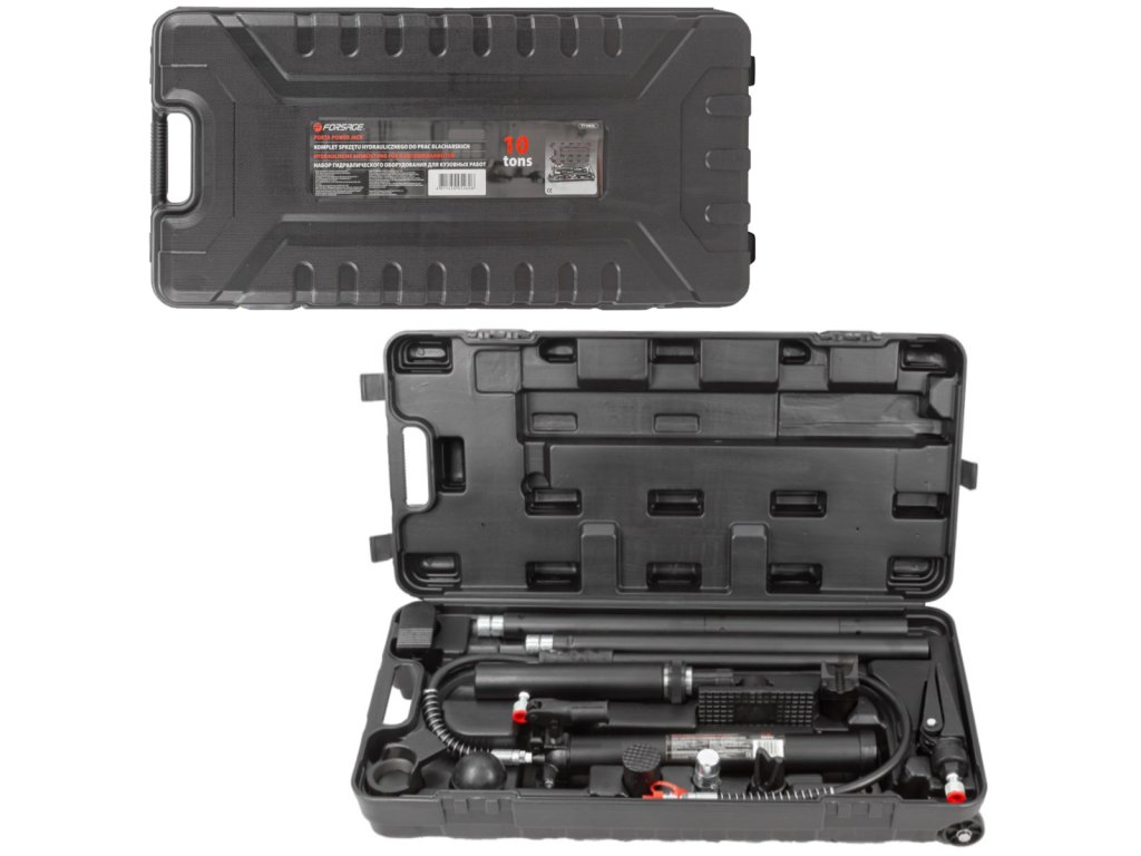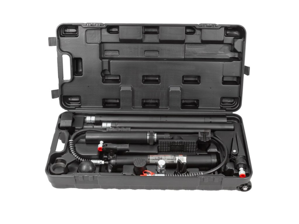 Set vsebuje hidravlično črpalko, valje, podaljške in ukrivljene nastavke. Lahko ga dopolnite tudi s hidravličnim valjem z obratnim tokom in pritrdilnimi nastavki.