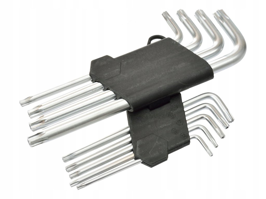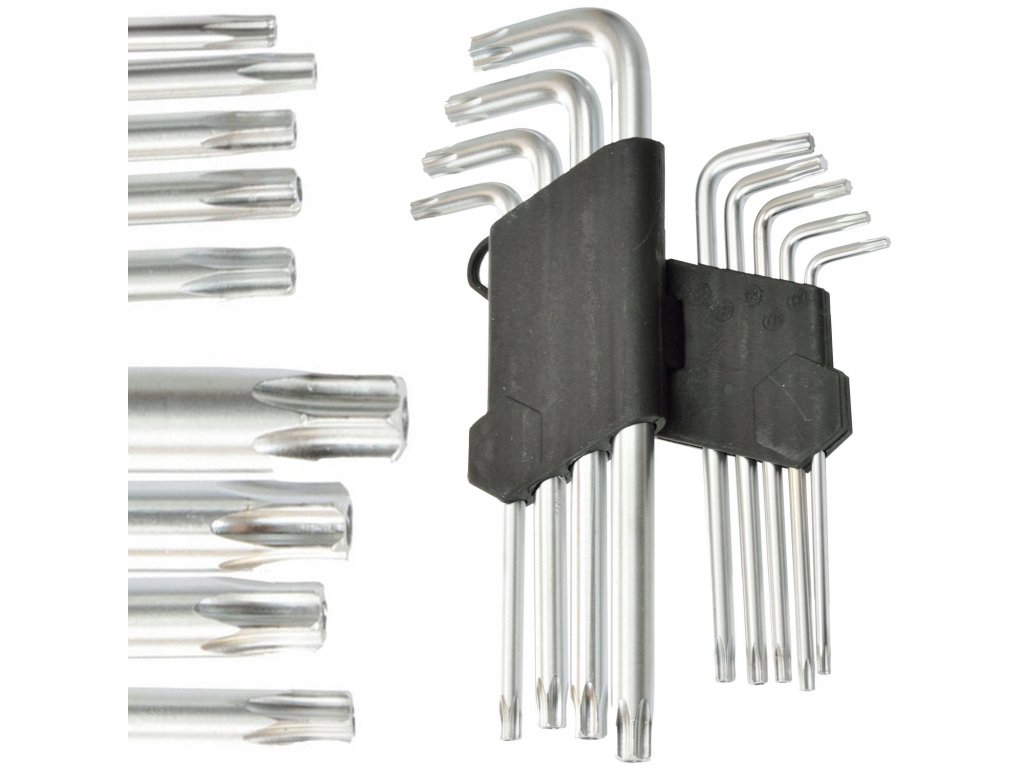 Ta set Torx ključev vsebuje devet dolgih ključev z luknjo, ki so izdelani iz visokokakovostnega krom-vanadij jekla. Ključi so shranjeni v praktičnem organizatorju z razdelki, kar olajša izbiro pravega ključa. Ta set zagotavlja dolgo življenjsko dobo in trdnost ključev, idealno za zahtevna dela.