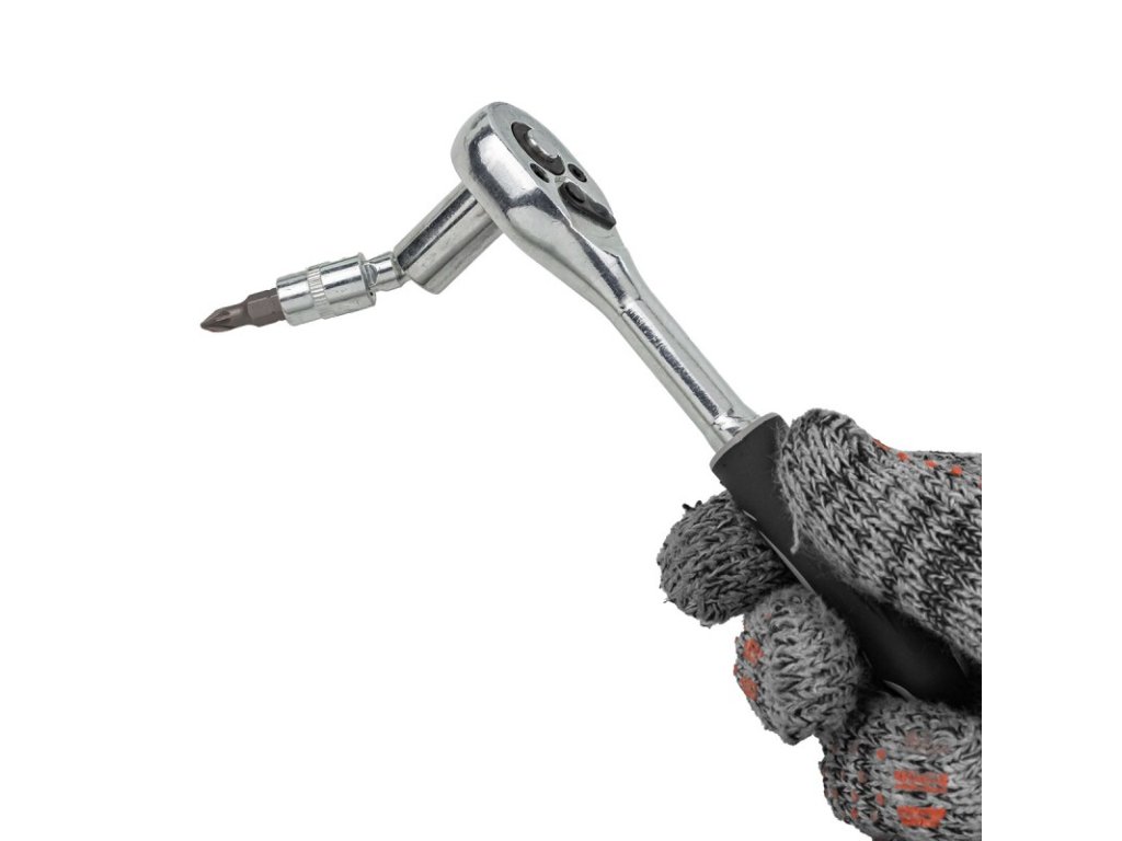 Set vključuje račni ključ z vzdržljivim zatičnim mehanizmom. V kompletu je bogat izbor ključev (velikosti od 4 do 14 mm) in izvijaških nastavkov (ravni, križni, šestrobi, Torx).