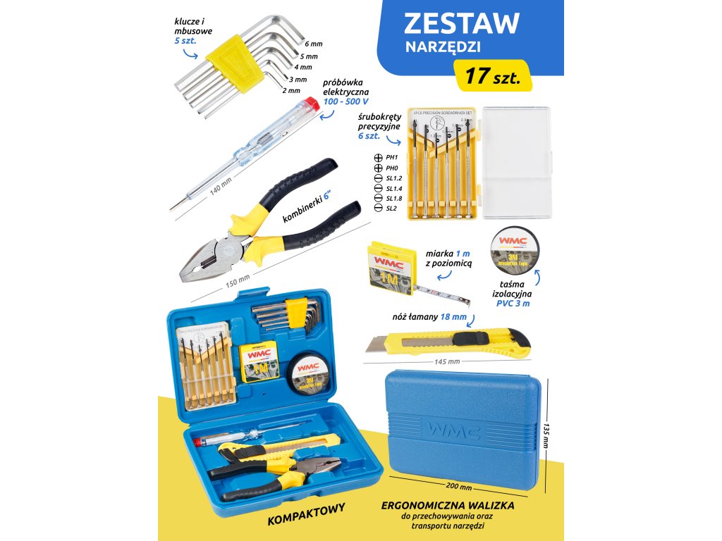 Komplet orodja 17 kosov: kombinirane klešče, izvijači, imbus ključi