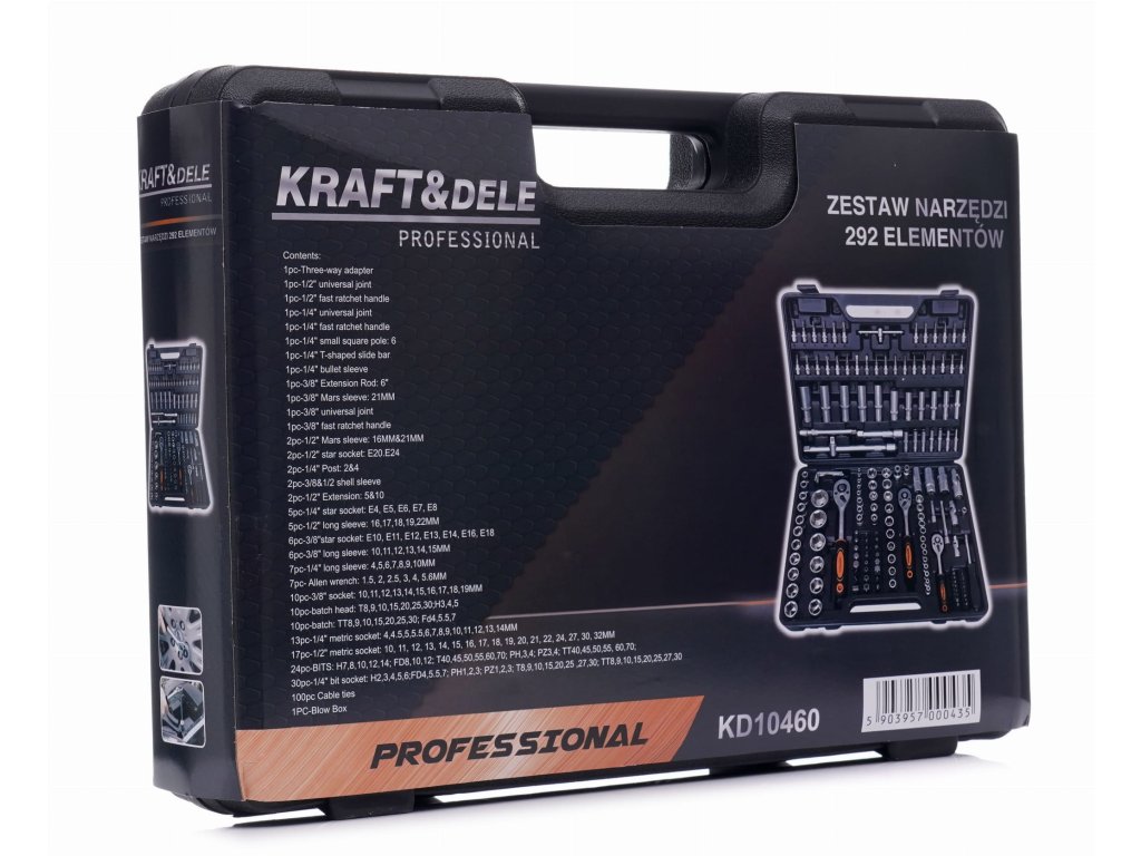 Zelo obsežen komplet orodja znamke Kraft&Dele z oznako KD10460. Orodje se odlikuje z natančno izdelavo, odpornimi materiali in praktičnim kovčkom, v katerem ima vsak kos svoje mesto.