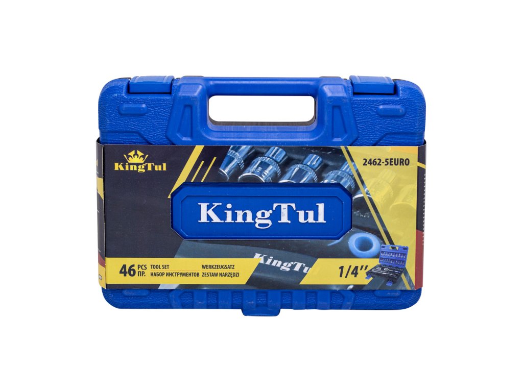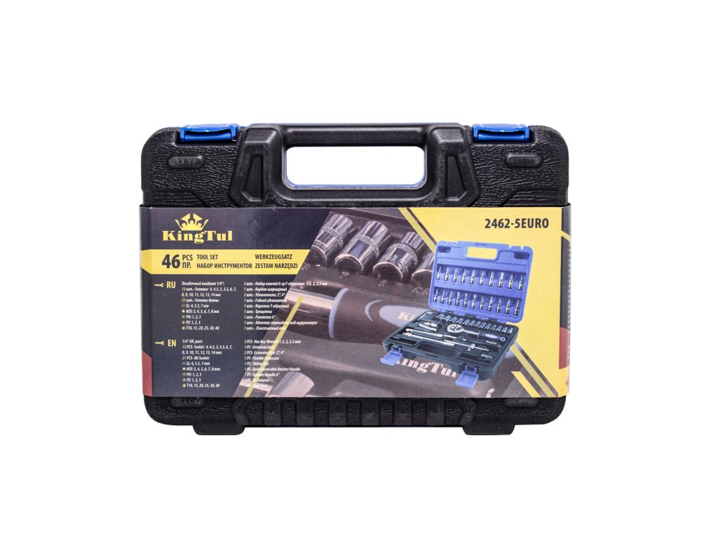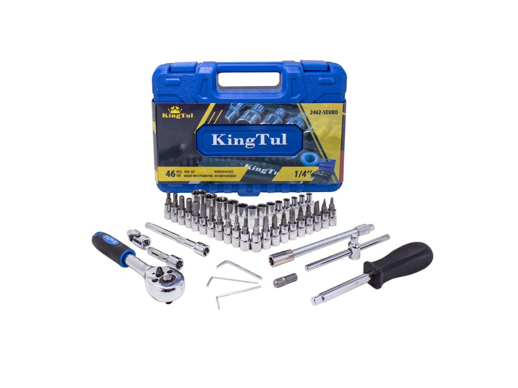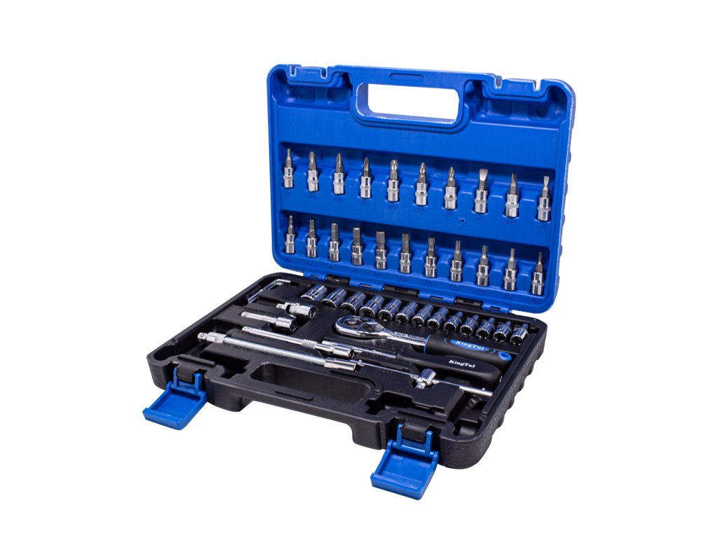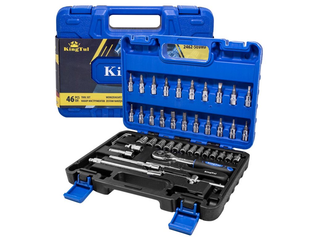 Del kompleta je račna z vzdržljivim zaskočni mehanizmom. Komplet vsebuje bogat izbor udarnih nasadnih glav (velikosti od 4 do 14 mm), nastavke za svečke, bite (ravne, križne, šestkotne, Torx). Dopolnjujejo ga podaljški (vključno s fleksibilnim), univerzalni sklep, imbus ključi, T-ročaj in držalo za bite. Vse je urejeno v praktičnem kovčku. Komplet je primeren tako za profesionalno kot domačo uporabo. Profesionalna izdelava in popuščeno krom-vanadijevo jeklo zagotavljata trdnost in vzdržljivost. Vse dimenzije so za udobje uporabnika označene.