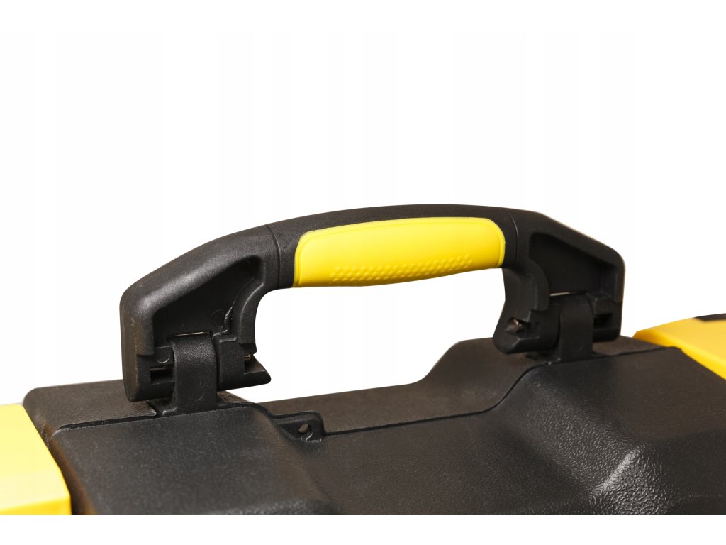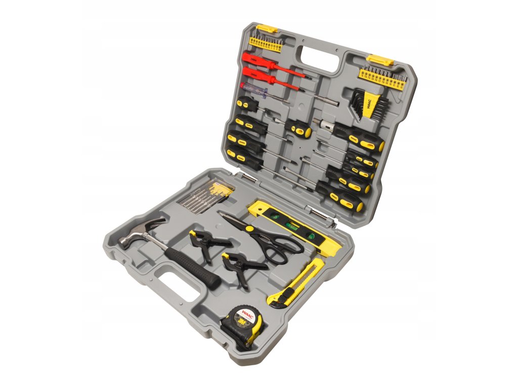 Set orodja v kovčku (mobilni kovček 2 v 1). Vgrajena kolesa olajšajo premikanje kovčka in teleskopski ročaj. Odlično izdelan kovček za orodje. Celoten set je izdelan z poudarkom na trdni kakovosti. Kovček s kolesi in izvlečnim teleskopskim ročajem za prenašanje kompleta (kot potovalni kovček).
