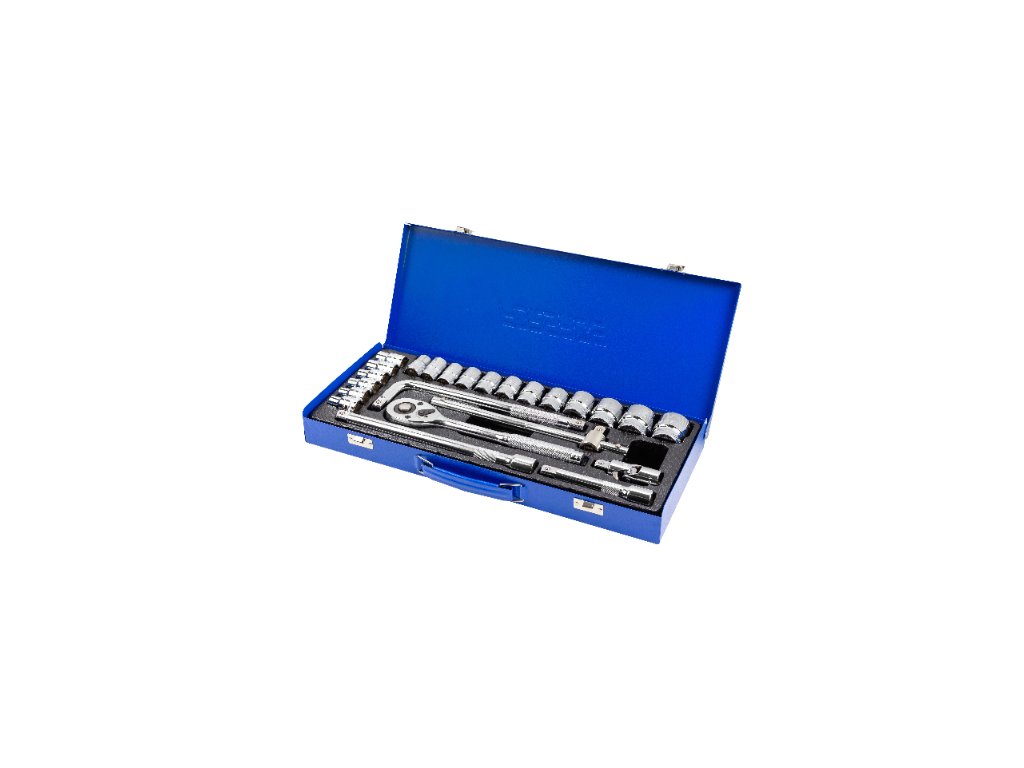 - Komplet vsebuje 24 delov v kovinskem kovčku. Vključuje ključe, podaljške, glave, račni ključ in kardanski sklep.