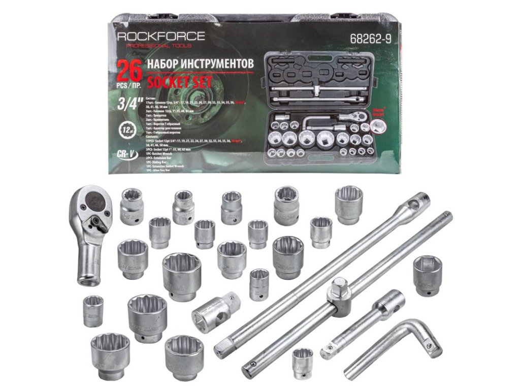 - Nasadni ključi 12-kraki 3/4" - 17 kosov: 17 mm, 19 mm, 21 mm, 22 mm, 24 mm, 27 mm, 30 mm, 32 mm, 33 mm, 34 mm, 35 mm, 36 mm, (36 mm - šesterokotni), 38 mm, 41 mm, 46 mm, 50 mm