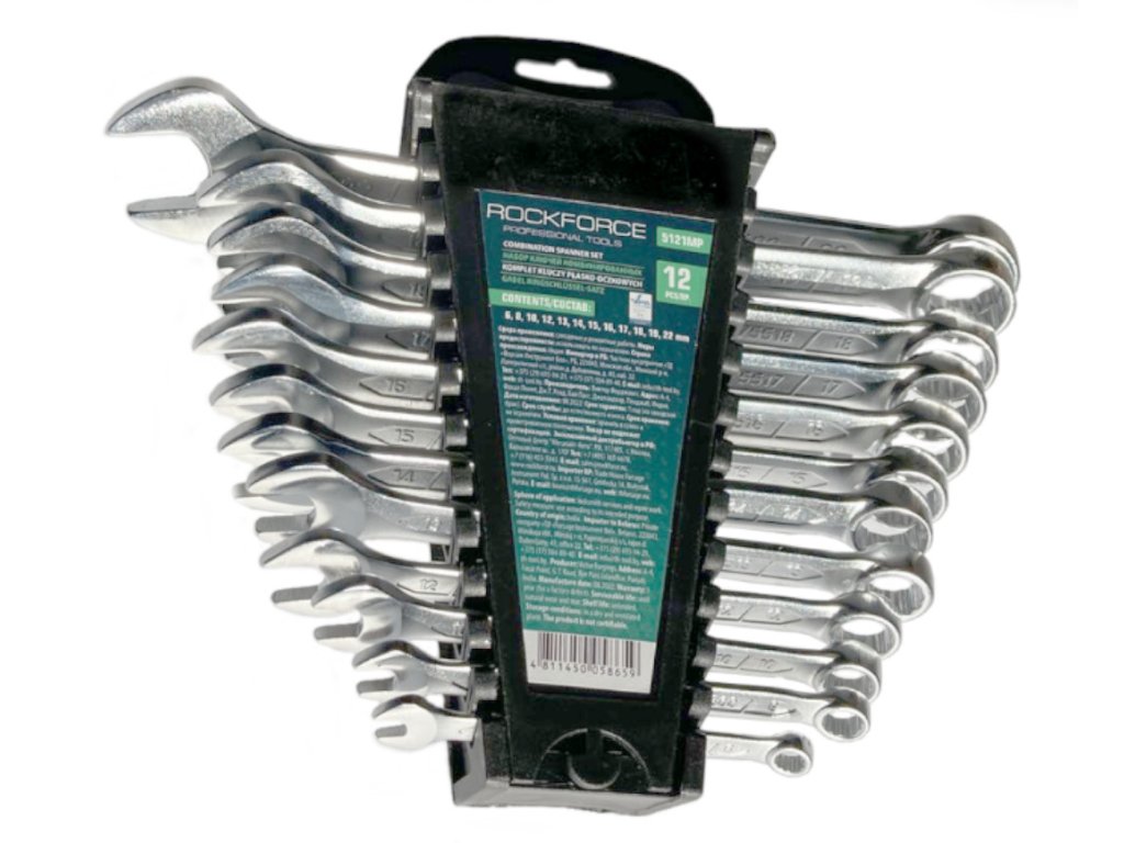 Komplet obročnih ravnih ključev znamke Rockforce. Izdelani iz jekla CrV, po standardu DIN 3110. Glave ključev so polirane.