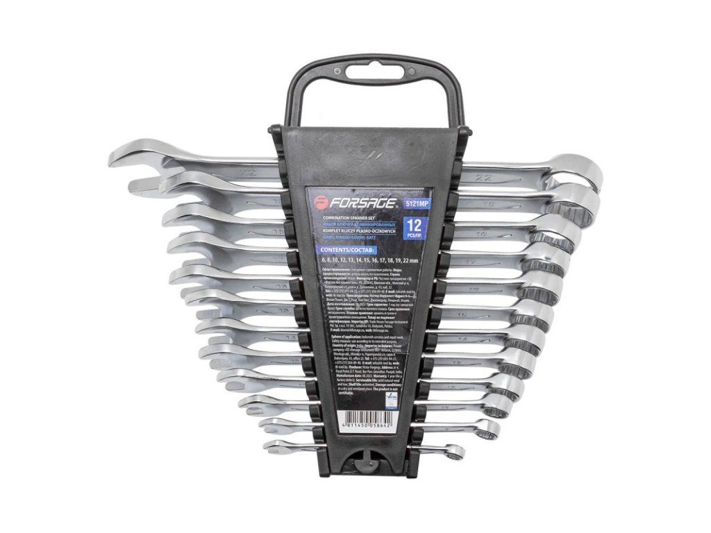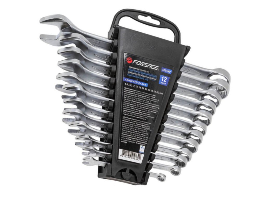 Set odprtih in očesnih ključev znamke Forsage. Narejeno iz jekla CrV, po standardu DIN 3110. Glave ključev so polirane.
