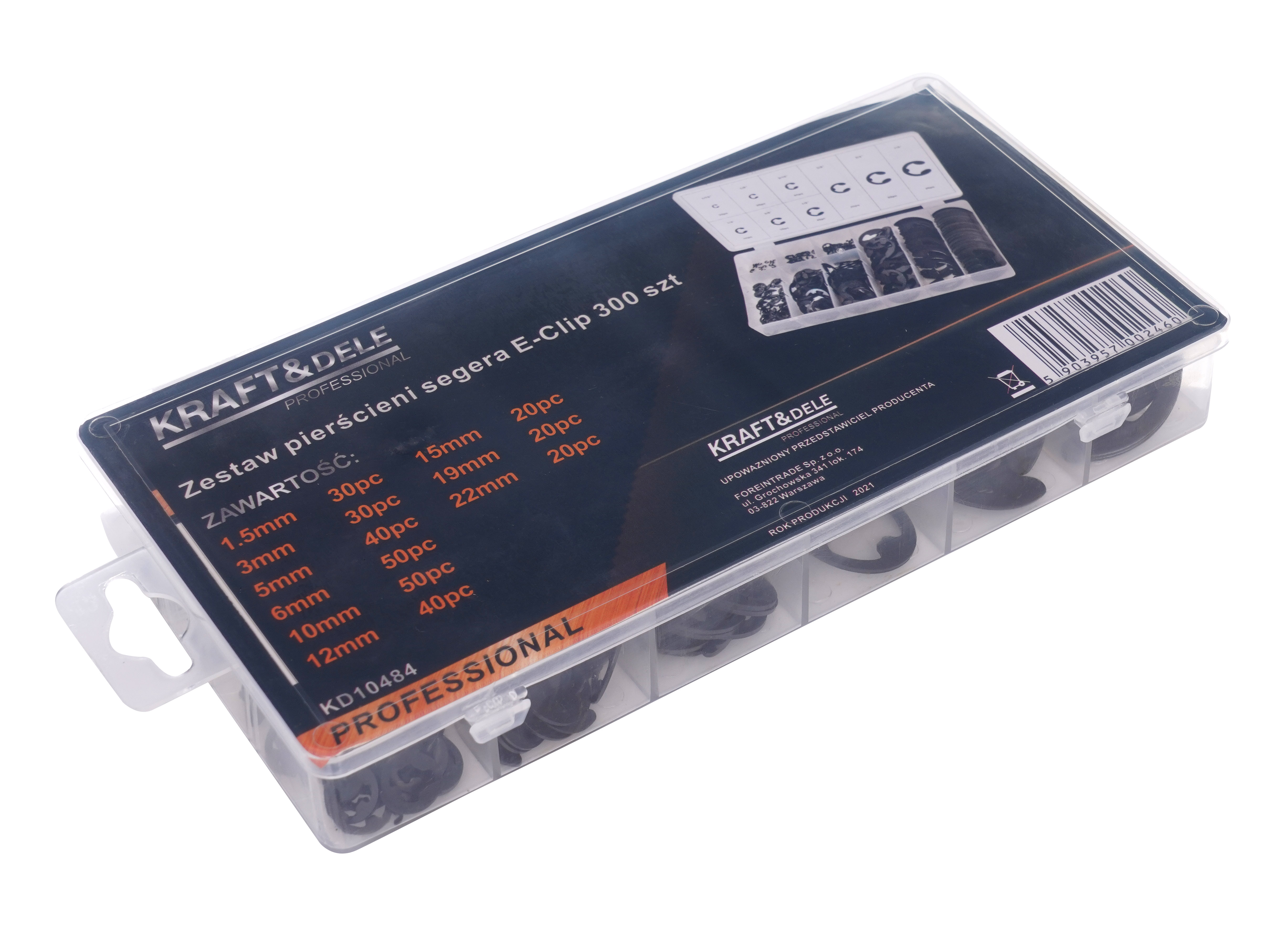 Profesionalni komplet varnostnih obročev E-CLIPS Kraft&Dele model KD10484 se uporablja za hitro pritrditev različnih pritrdilnih in obešalnih elementov.